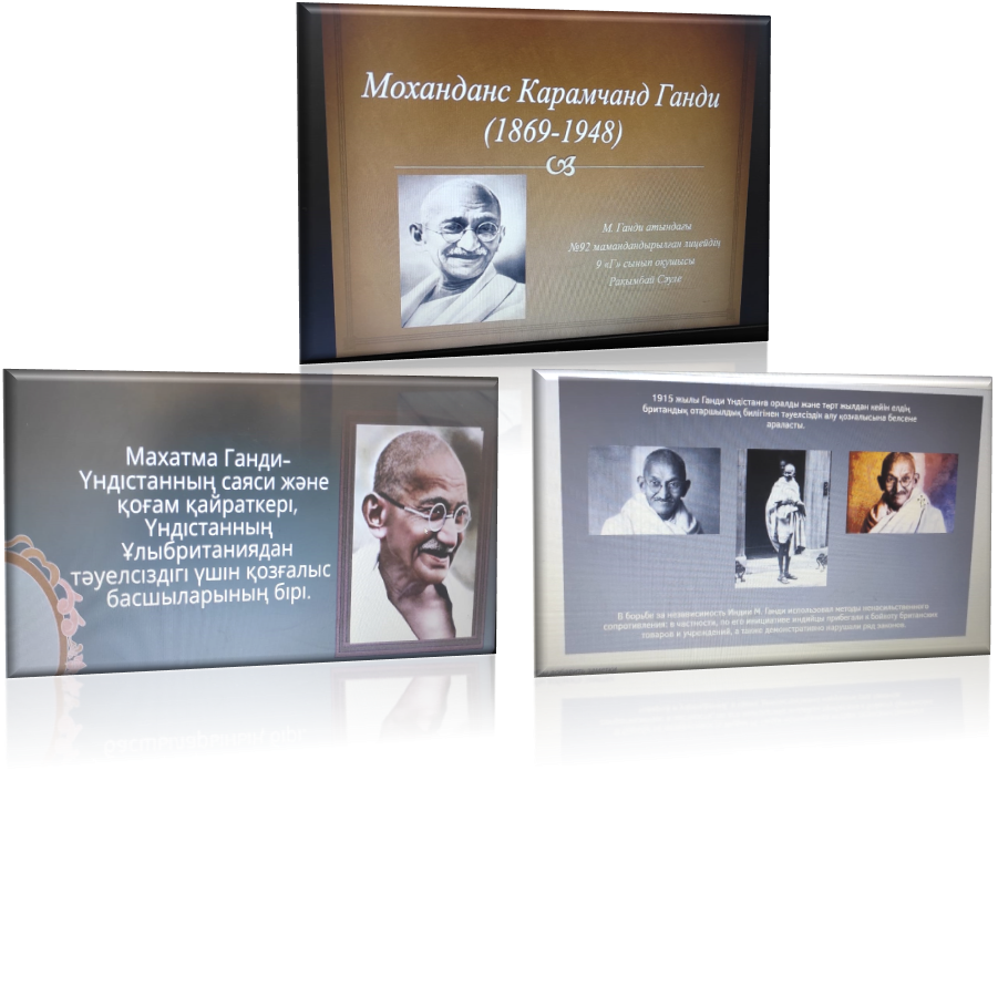 Мохандас Карамчанд Ганди 2 қазан 1869 жылы Порбпандар қаласында дүниеге келген. Махатма Ганди Үндістан ұлттық азаттық қозғалысының идеологы әрі жетекшілерінің бірі. Гандидің этикалық көзқарасы: «кедейлікке, доқшылыққа мейірімділікпен қарау, жапа шегу, тақуалық принциптері мен қоғамдағы дамуы-адамның өсімпаз мұқтажын қамтамасыз ету арқылы емес, соны саналы түрде тежеу арқылы іске асырылуы керек» деген көзқарасты ұстанды. Ганди негізінде өз еліне зорлық-зомбылықсыс, қару жарақсыз тәуелсіздікті алған. Әр адам басында ой түсігінде адамгершілік, түсініспеншілік, рақымдылық, күш жігер және т.б. болу керек.