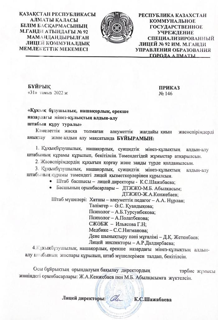 01 сентябрь 2022 0 1 2 3 4 5 БҰЙРЫҚ "Құқық бұзушылық, нашақорлық, ерекше назардағы мінез-құлықтың алдын алу штабын құру туралы"