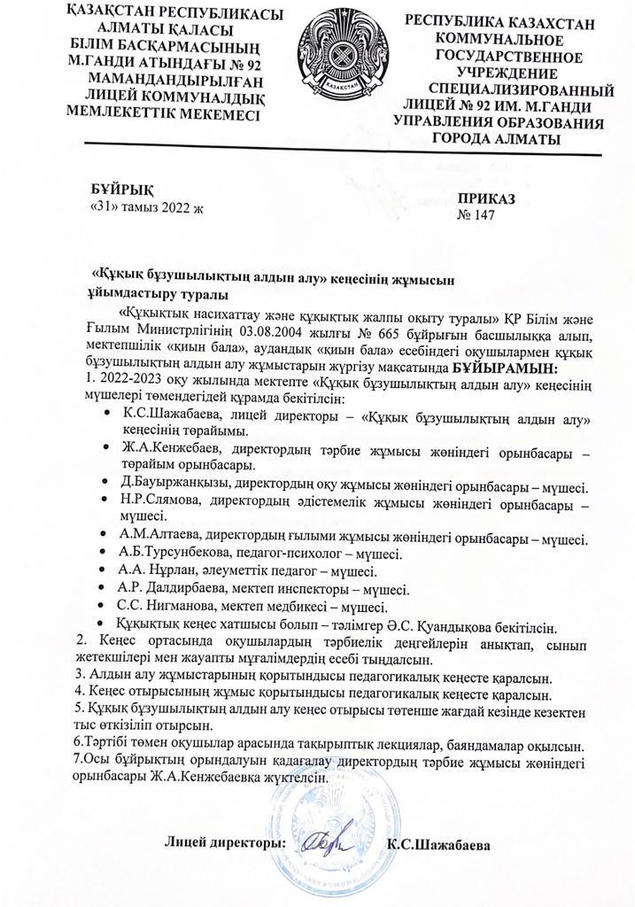 01 сентябрь 2022 0 1 2 3 4 5 БҰЙРЫҚ "Құқық бұзушылықтың алдын алу" кеңесінің жұмысын ұйымдастыру туралы