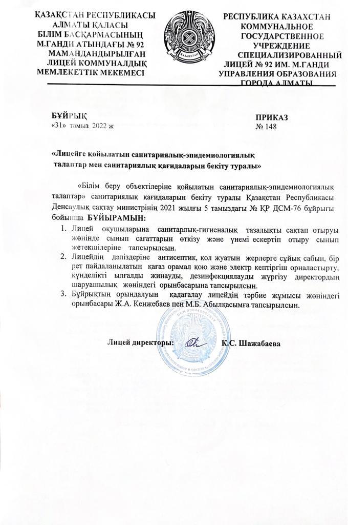 01 сентябрь 2022 0 1 2 3 4 5 БҰЙРЫҚ "Лицейге қойылатын санитралық-эпидемиологиялық талаптар мен санитарлық қағидаларын бекіту туралы"