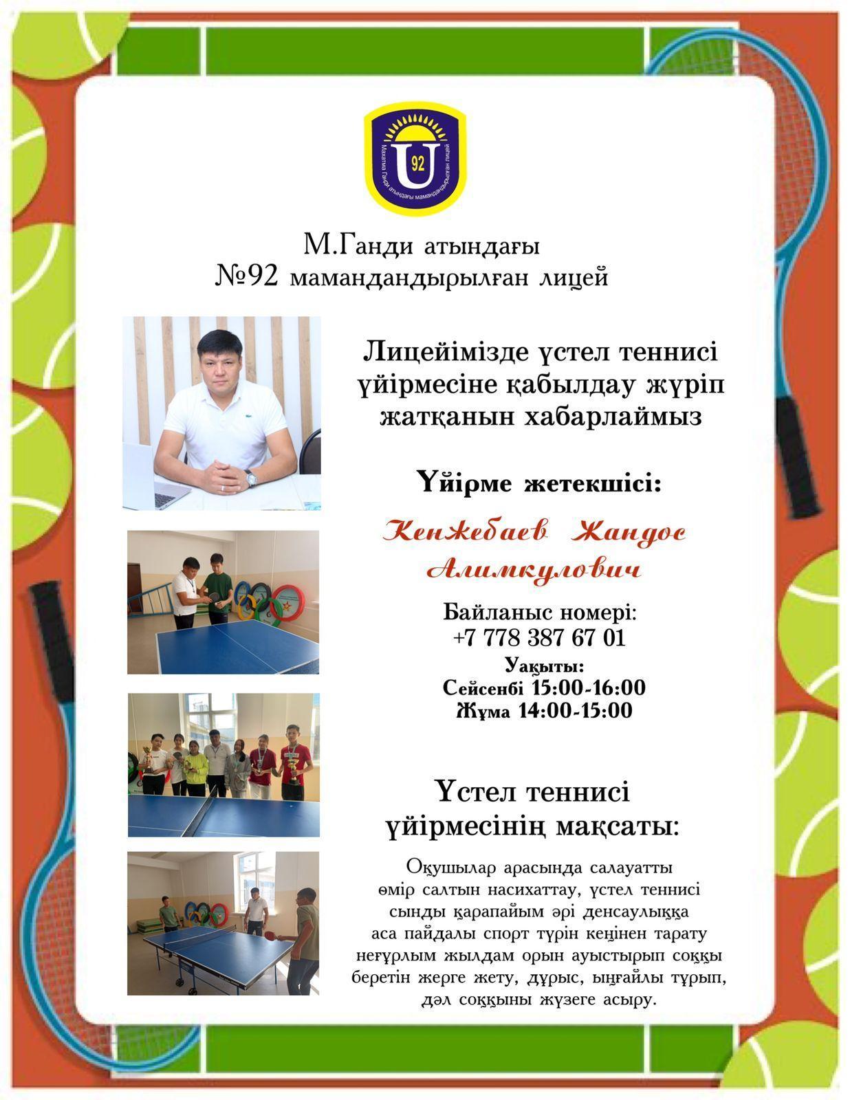 20 сентябрь 2022 0 1 2 3 4 5 Үстел теннисі үйірмесі 📣 Хабарландыру!М.Ганди атындағы №92 мамандандырылған лицейде үстел теннисі үйірмесіне қабылдау жүріп жатқанын хабарлаймыз! 🏓Үйірме жетекшісі: Кенжебаев Жандос Алимкулович