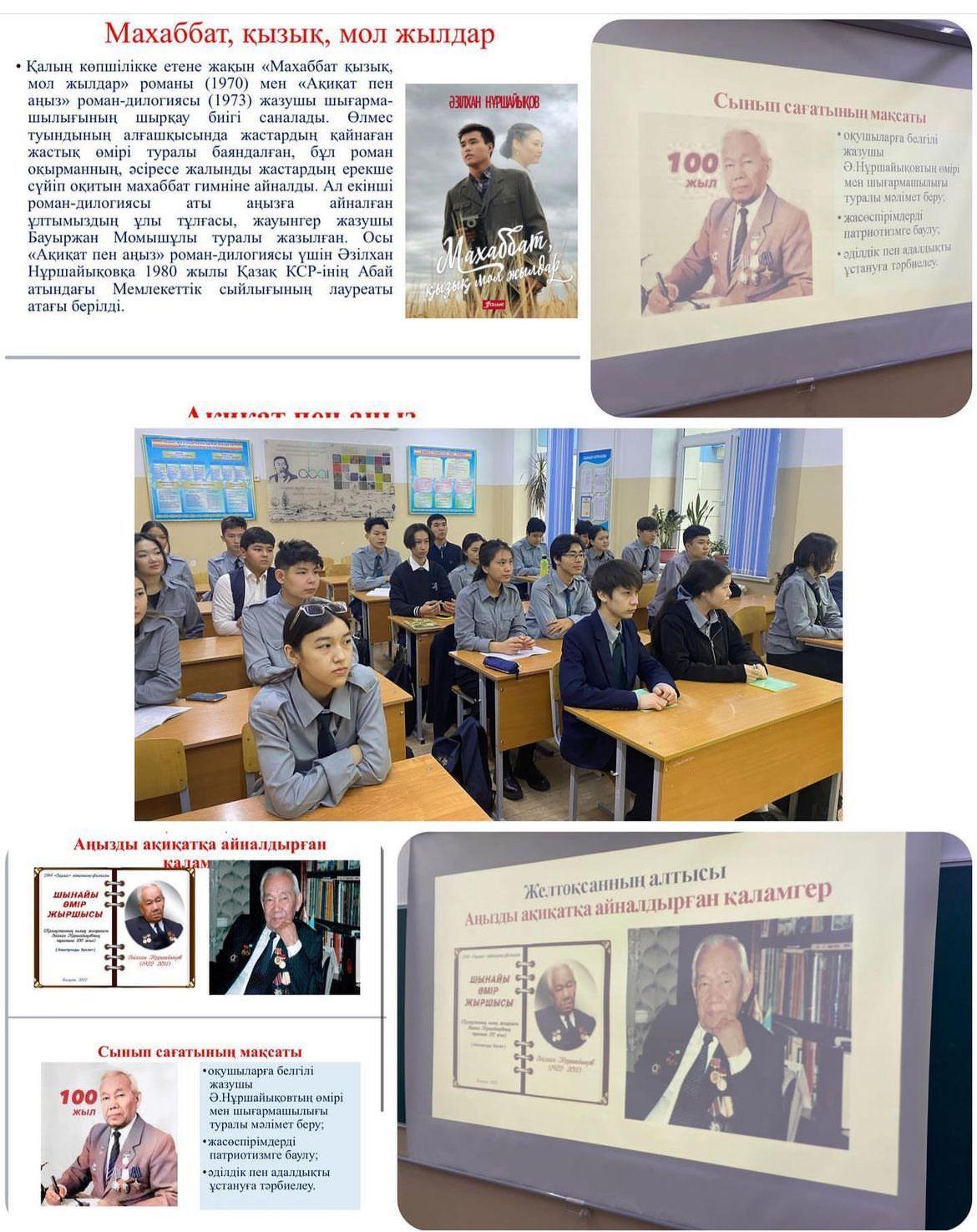 6 желтоқсан 2022 жылы 10 "А" сыныбында белгілі жазушы Ә.Нұршайықовтың 100 жылдығына арналған "Аңызды ақиқатқа айналдырған" қаламгер тақырыбында сынып сағаты өтті.