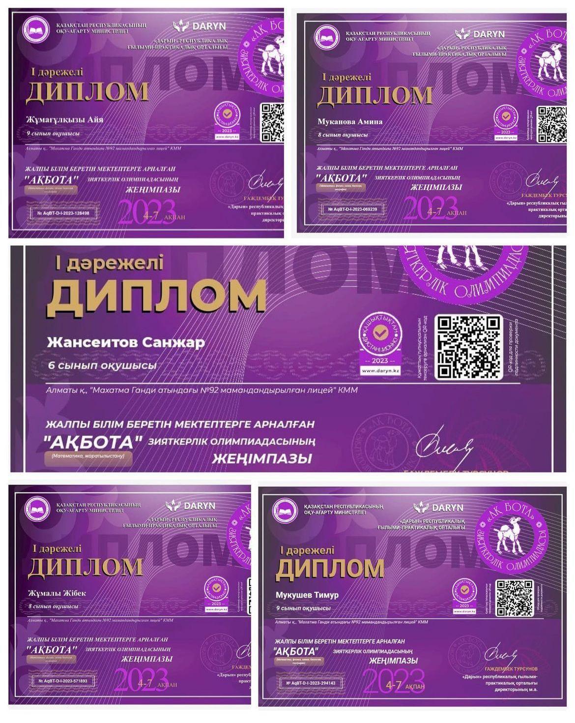 Лицейіміздің 6 сынып оқушысы Жансеитов Санжар, 8 сынып оқушылары Муканова Амина, Жұмалы Жібек, 9 сынып оқушылары Жұмағұлқызы Айа, Мукушев Тимур «Дарын» Республикалық ғылыми-практикалық орталығының ұйымдастыруымен өткен «Ақ бота» зияткерлік олимпиадасында I 🥇 дәрежелі дипломмен марапатталды!!!