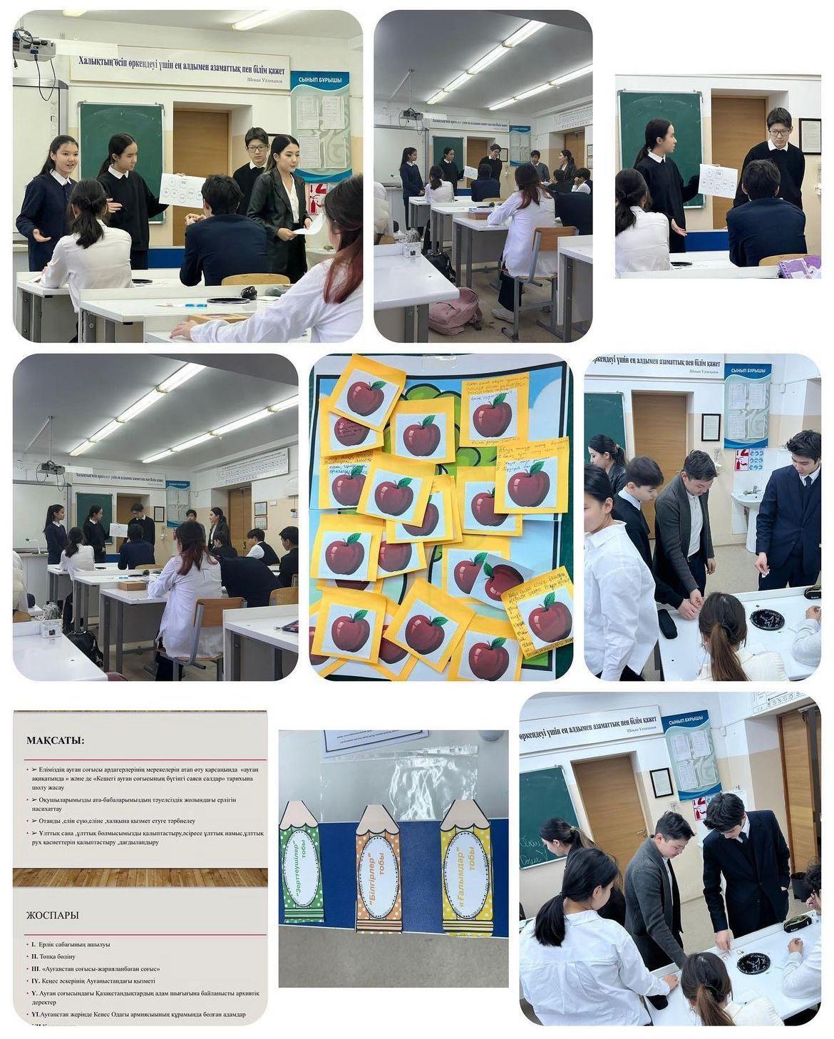 Лицейіміздің 9 “А” сыныбында “Ауғанның отты жалыны” тақырыбында сынып сағаты өтілді. 🔹Мақсаты: Еліміздің ауған соғысы ардагерлерінің мерекелерін атап өту қарсаңында «Ауған ақиқатында» және де «Кешегі Ауған соғысының бүгінгі саяси салдар» тарихына шолу жасау