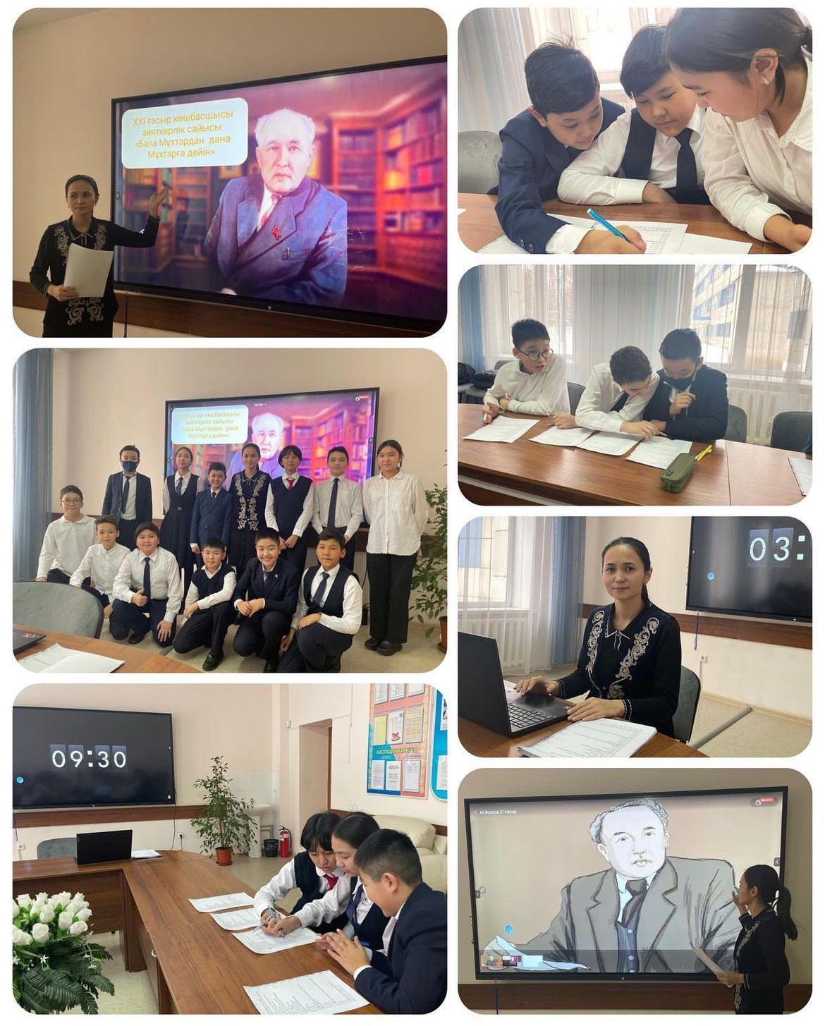 Қоғамдық-гуманитарлық пәндер мұғалімдері кафедрасының онкүндігі аясында қазақ тілі мен әдебиеті пәнінің мұғалімі Қуанбаева Бағдат Сұлтанбекқызының 16 ақпан 2023 жылы 6 А,Ә,Б,В сыныптар арасында “Бала Мұхтардан, дана Мұхтарға дейін” атты XXI ғасыр көшбасшысы зияткерлік сайысы өткізілді. Сайыс тест тапсырмалары арқылы алынды. Сабаққа кафедра және басқа да пән мұғалімдері қатысты.