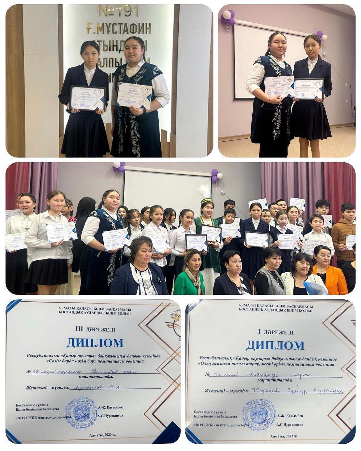 «Өлең жаздым тоғыз тарау, жеті өрім» номинациясы бойынша 8 «А» сынып оқушысы Миятқызы Мереке 🥇1-орын, «Сөзім барда- өзім бар» номинациясы бойынша 9 «Г» сынып оқушысы Рақымбай Сәуле 🥉3-орын алды.