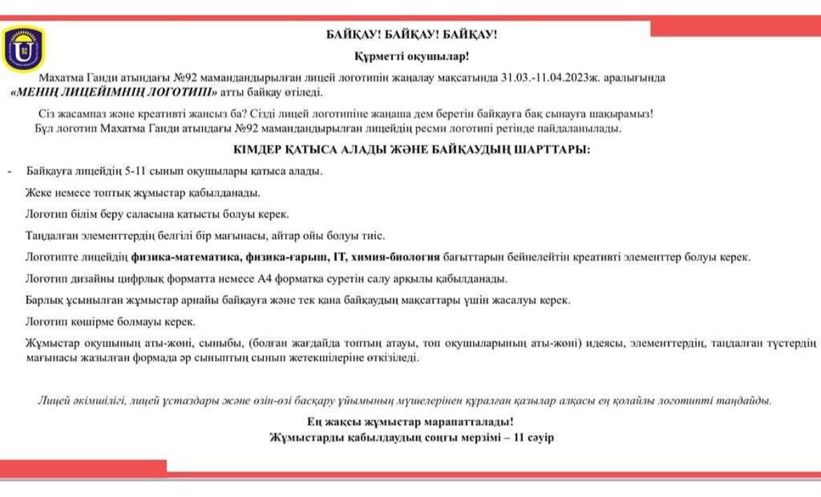 Махатма Ганди атындағы №92 мамандандырылған лицей логотипін жаңалау мақсатында 31.03.-11.04.2023ж. аралығында «МЕНІҢ ЛИЦЕЙІМНІҢ ЛОГОТИПІ» атты байқау өтіледі.