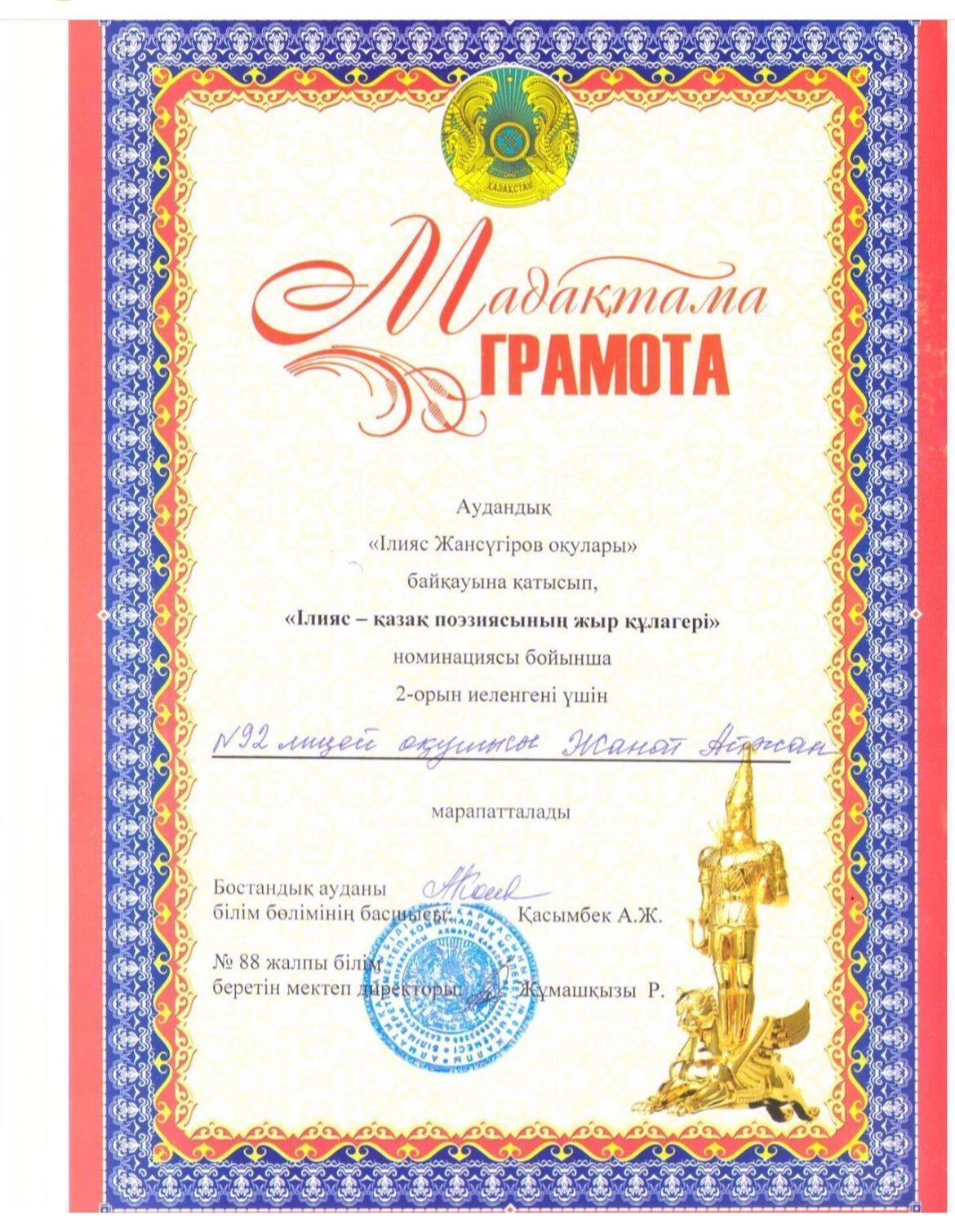 12 апрель 2023 0 1 2 3 4 5 Ілияс Жансүгіров оқулары Аудандық «Ілияс Жансүгіров оқулары» байқауына қатысып, «Ілияс-қазақ поэзиясының жыр құлагері» номинациясы бойынша II орын иеленгені үшін лицейіміздің 9 сынып оқушысы Жанат Айжан марапатталды!!!Құттықтаймыз!!!
