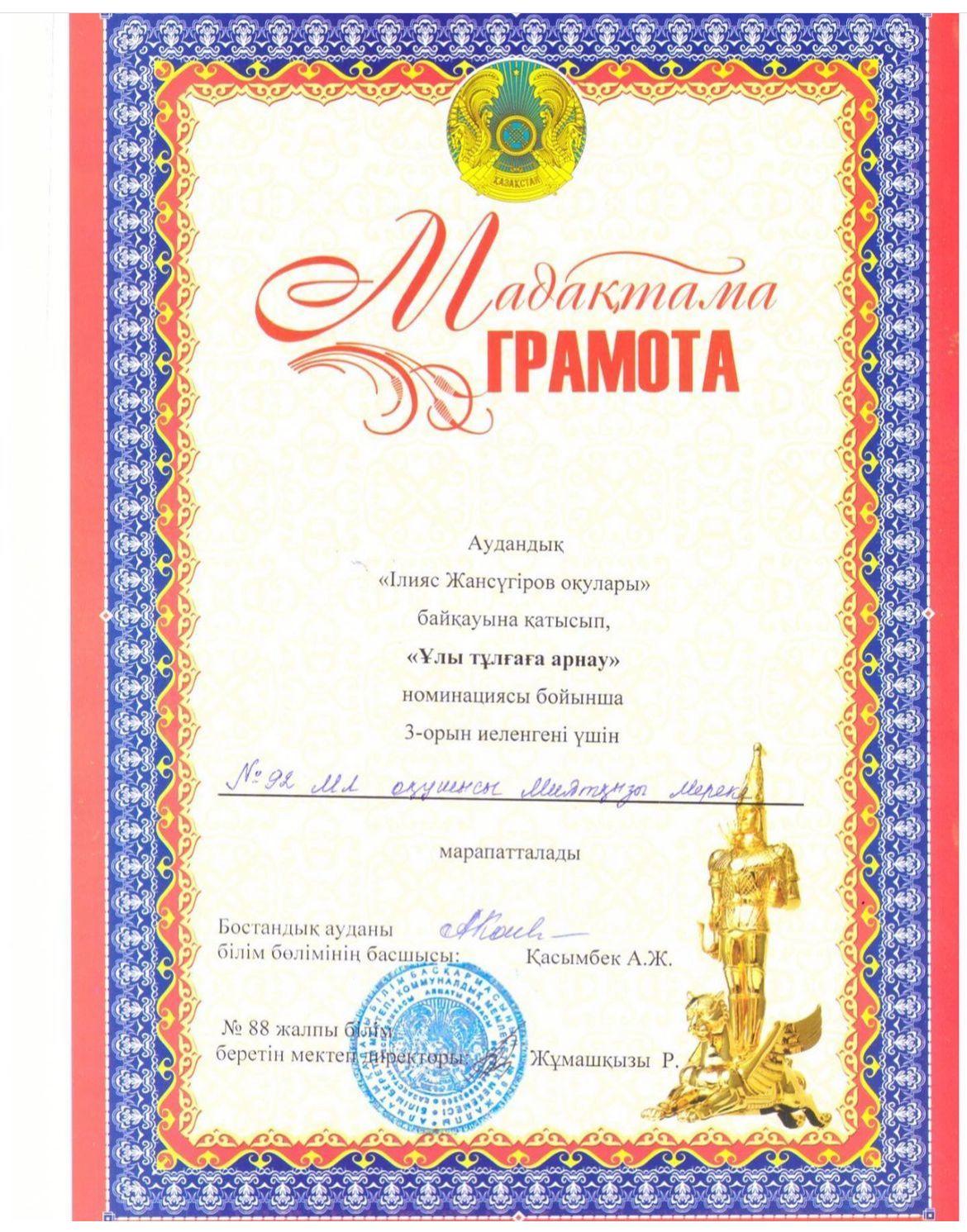 12 апрель 2023 0 1 2 3 4 5 Ілияс Жансүгіров оқулары Аудандық «Ілияс Жансүгіров оқулары» байқауына қатысып, «Ұлы тұлғаға арнау» номинациясы бойынша III орын иеленгені үшін лицейіміздің оқушысы Миятқызы Мереке марапатталды!!!Құттықтаймыз!!!