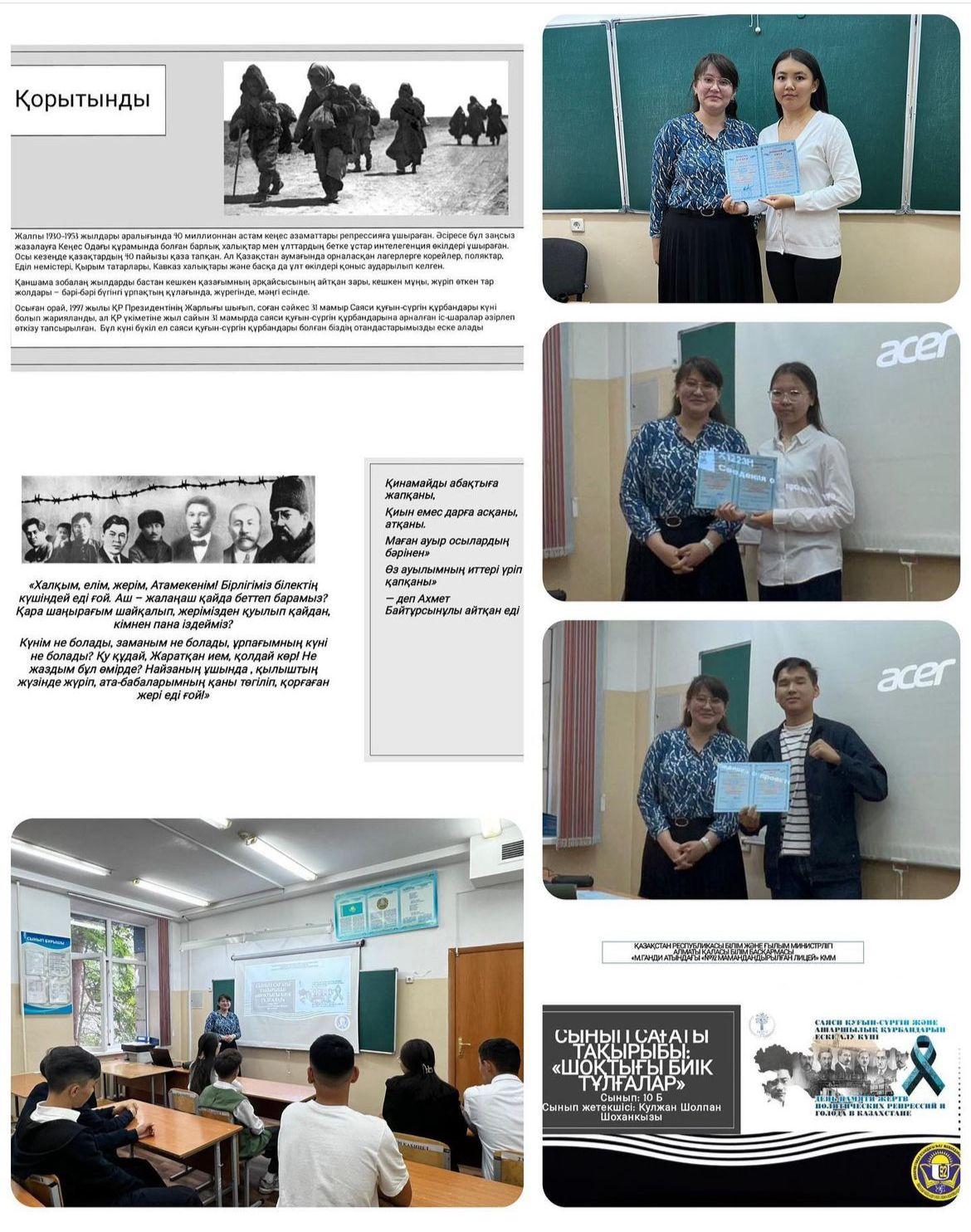 31 мамыр 2023 жылы Махатма Ганди атындағы №92 мамандандырылған лицейдің 10 «Б» сыныбында «Шоқтығы биік тұлғалар» тақырыбында сынып сағаты өтілді. Сынып сағаты барысында үздік оқушылар мақтау қағаздарымен марапатталды.💐 🔹Мақсаты: Білімділік: Сталинизмнің орнығуы, жазалау шаралары. Халық қасіреті. Қазақстан – лагерлер өлкесі. Кеңес Одағы кезіндегі Қазақстанда салынған еңбекпен түзеу лагерлерінің тарихына шолу жасау.