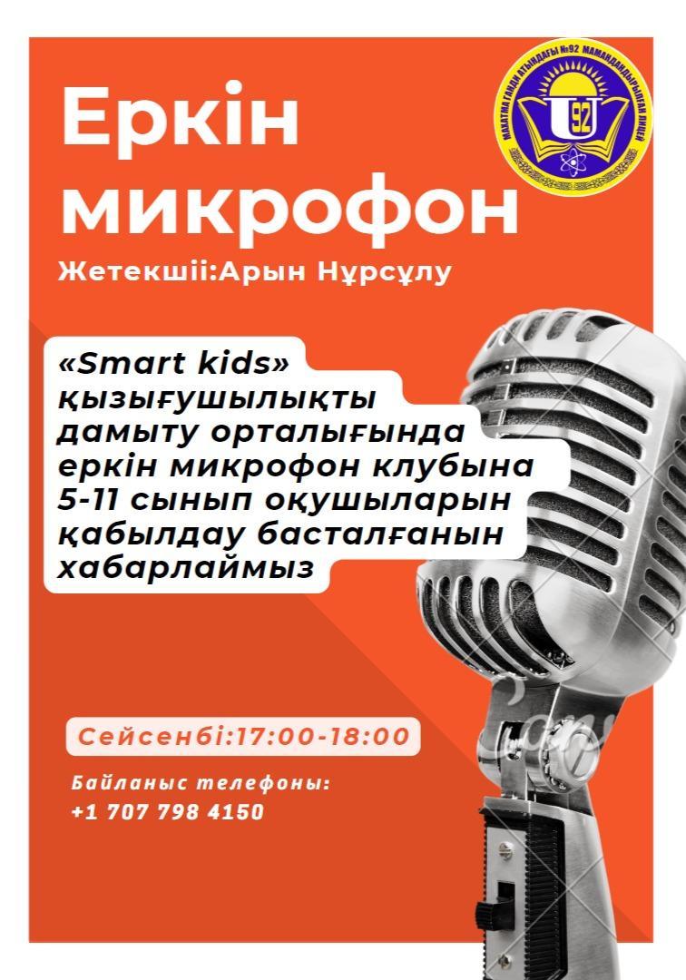 15 сентябрь 2023 0 1 2 3 4 5 Еркін микрафон клубы Хабарландыру! М.Ганди атындағы №92 мамандандырылған лицей "Smart kids" қызығушылықты дамыту орталығында еркін микрафон клубына қабылдау жүріп жатқанын хабарлаймыз! Клуб жетекшісі: Арын Нұрсұлу.