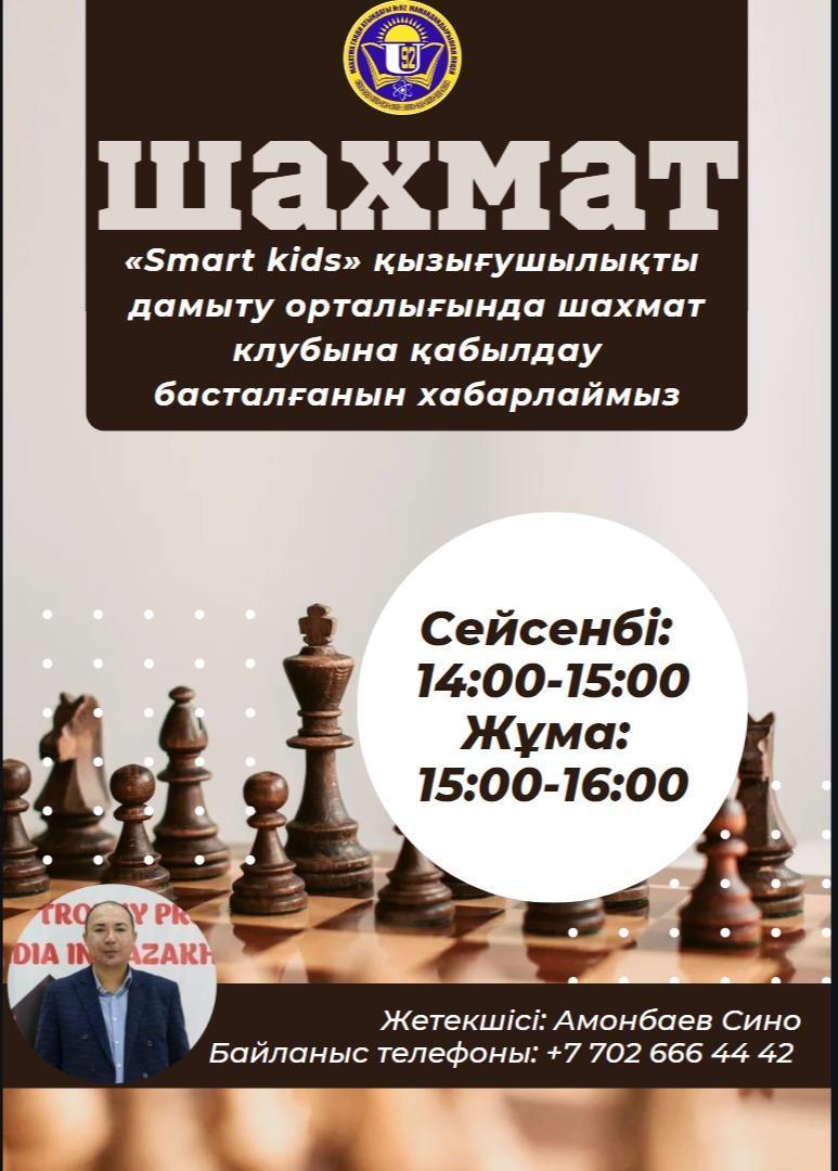 15 сентябрь 2023 0 1 2 3 4 5 Шахмат клубы Хабарландыру! М.Ганди атындағы №92 мамандандырылған лицей "Smart kids" қызығушылықты дамыту орталығында шахмат клубына қабылдау жүріп жатқанын хабарлаймыз! Клуб жетекшісі: Амонбаев Сино.
