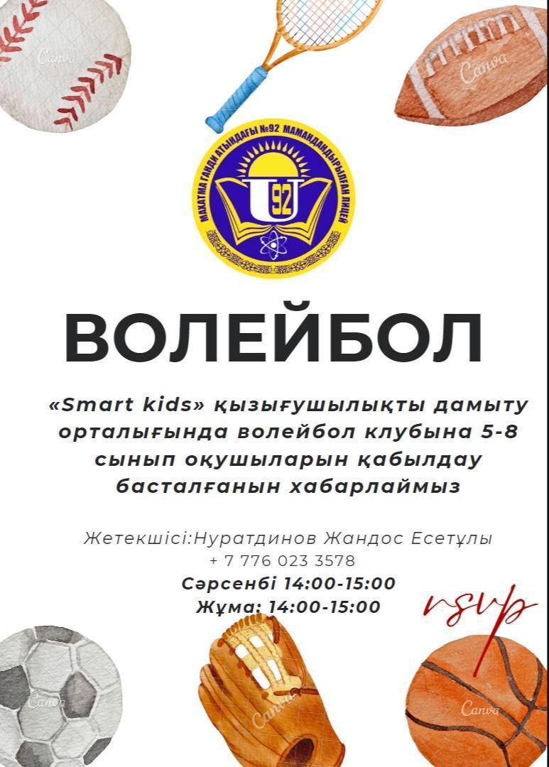 15 сентябрь 2023 0 1 2 3 4 5 Волейбол клубы Хабарландыру! М.Ганди атындағы №92 мамандандырылған лицей "Smart kids" қызығушылықты дамыту орталығында 5,6,7,8 сыныптар арасында волейбол клубына қабылдау жүріп жатқанын хабарлаймыз! Клуб жетекшісі: Нуратдинов Жандос Есетұлы.