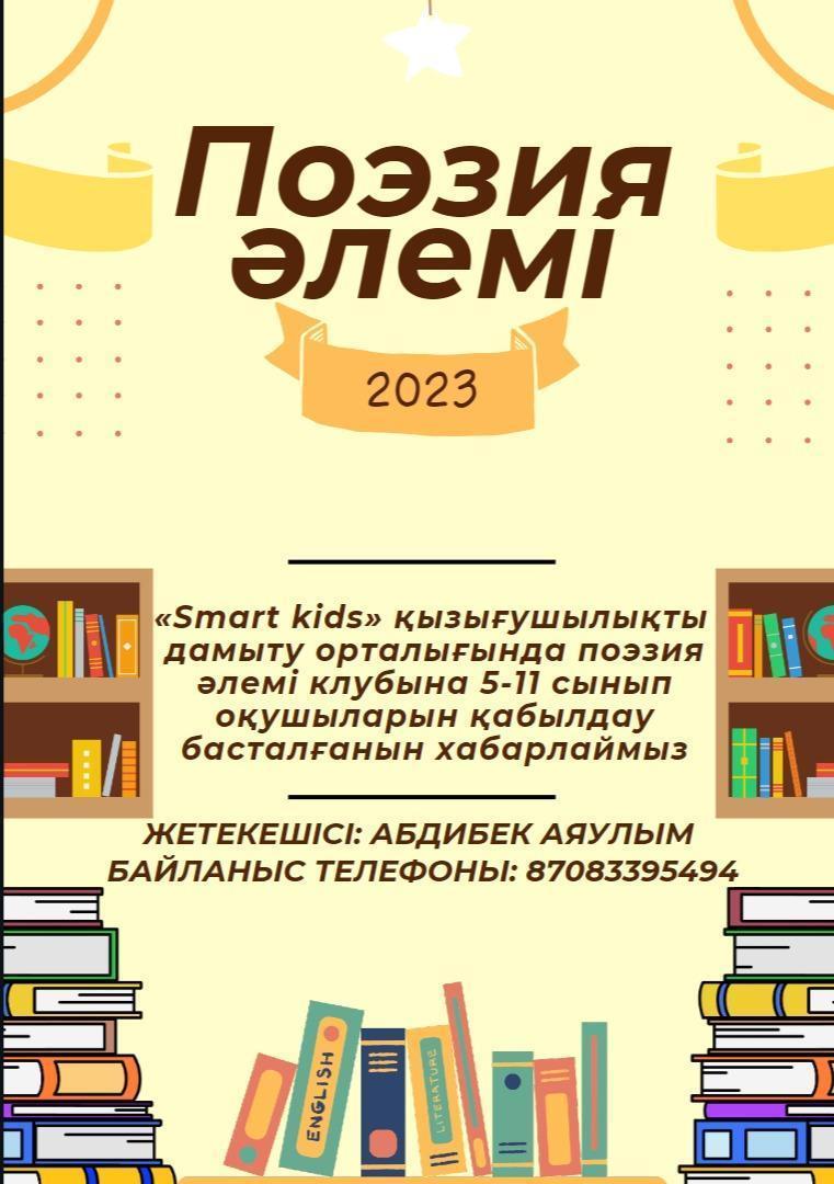 15 сентябрь 2023 0 1 2 3 4 5 Поэзия әлемі клубы Хабарландыру! М.Ганди атындағы №92 мамандандырылған лицей "Smart kids" қызығушылықты дамыту орталығында поэзия әлемі клубына қабылдау жүріп жатқанын хабарлаймыз! Клуб жетекшісі: Абдибек Аяулым.