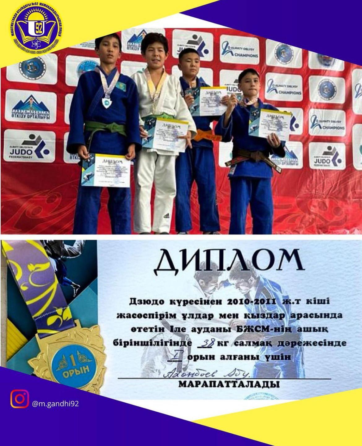 11 октябрь 2023 0 1 2 3 4 5 Іле ауданы Дзюдо күресінен ашық біріншілігі Дзюдо күресінен 2010-2011жж. кіші жасөспірім ұлдар мен қыздар арасында өтетін Іле ауданы БЖСМ-нің ашық біріншілігінде 6 “Б” сынып оқушысы Аханбаев Абубакир 1-орынмен иеленді.Құттықтаймыз!