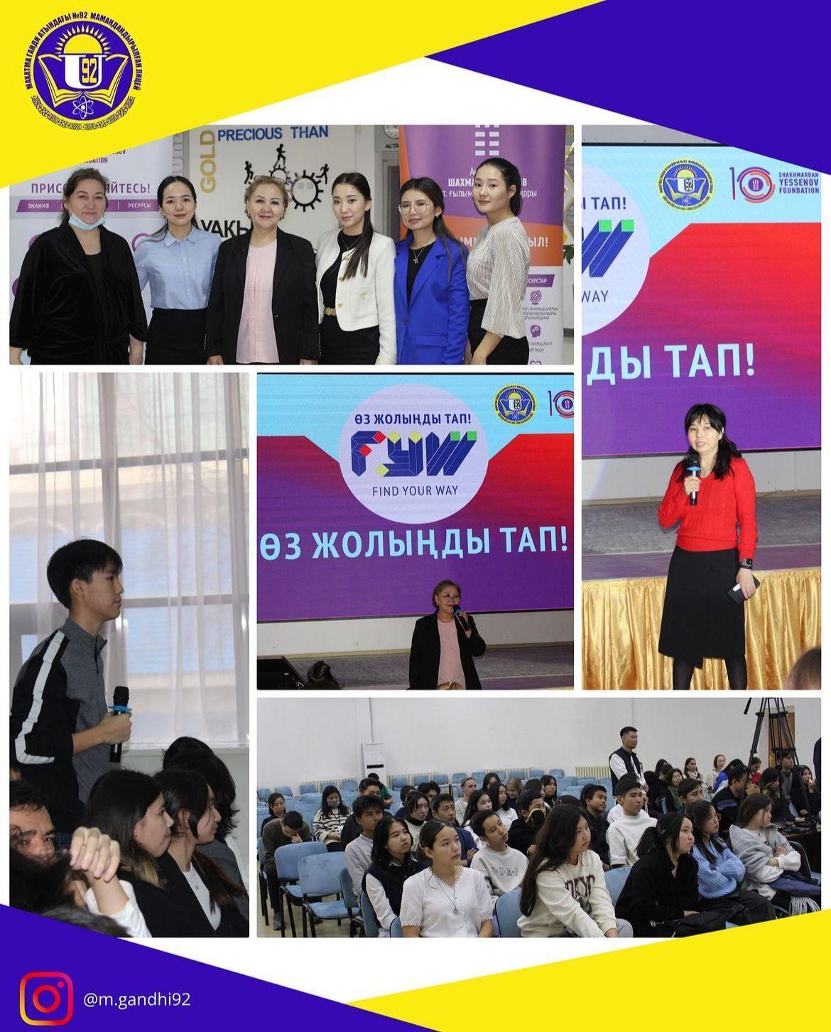 02.12.2023ж. күні Алматы қаласы, Махатма Ганди атындағы №92 мамандандырылған лицейде Shakhmardan Yessenov Foundation «Find Your Way» жобасының аясында алғаш рет қазақ тілінде 14-18 жастағы оқушылармен кездесу өткізілді.