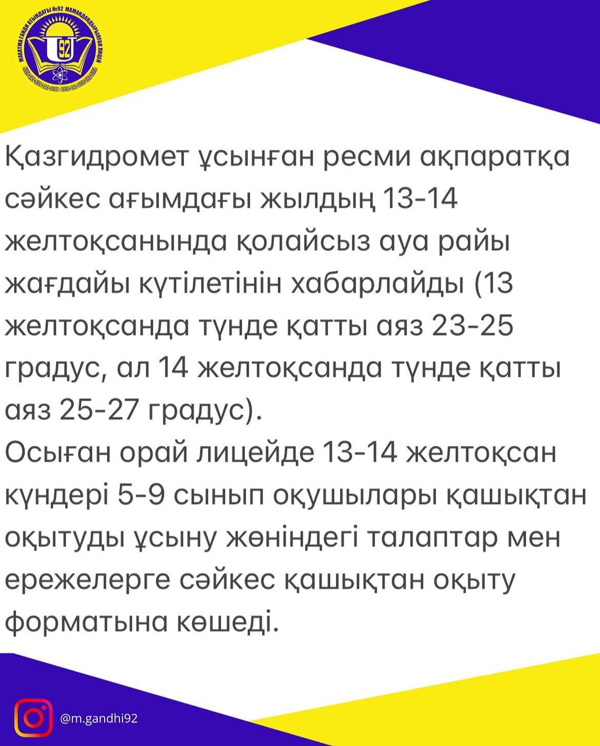 Осыған орай лицейде 13-14 желтоқсан күндері 5-9 сынып оқушылары қашықтан оқытуды ұсыну жөніндегі талаптар мен ережелерге сәйкес қашықтан оқыту форматына көшеді.