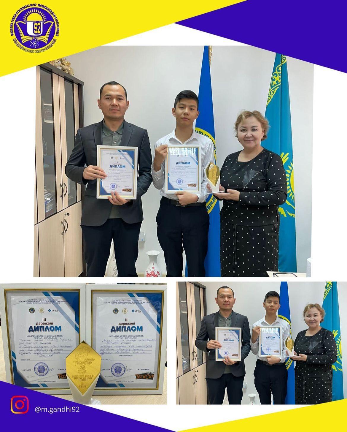 «Болашақ бизнес көшбасшысы» стартап форумының «Әлемді өзгерткен ғылым» номинациясы бойынша Махатма Ганди атындағы №92 мамандандырылған лицейдің 9-сынып оқушылары Байжуманов Батырхан мен Оралтай Абдуллаh I дәрежелі диплом және кубокпен марапатталды.