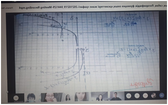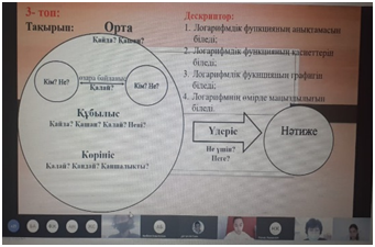 4. Жалпылау кезеңінде топтық жұмыс «Миға шабуыл». «Ойлан, жұптас, пікірлес» әдісі алгебра мен әдебиет пәндері бойынша пәнаралық тапсырма берілді. Логарифмдік және көрсеткіштің функцияларды және биссектриса х=y функцияларын «Көксерек» әңгімесімен байланыстыру болды. Қазақ тілі мен әдебиеті пәнінің мұғалімі Юлдашева Гулнура осы тапсырма бойынша оқушыларға бағыт-бағдар берді. Тірек сөздер ұсынды.
