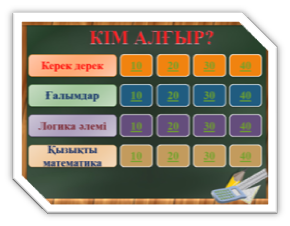 3-сайыс. Сайысты Бұл сайыста топ мүшелері бірігіп, 10-20-30-40 баллдық ұяшық нөмірін таңдап, сұрақтарға жауап берді. Ойлануға 3минут уақыт беріледі. Топ мүшелері ватцап желісінде ақылдасып, өз жауаптарын айтады. Жауап дұрыс болмаған жағдайда, келесі топ мүшелеріне жауап беру құқығы берілді.