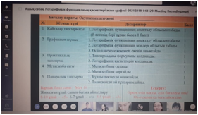 Ашық сабаққа лицейіміздің ғылыми жетекшісі Тұрарбеков М.З. және 12-мұғалім 13-практикант қатысты. Сабақ аралас сабақ түрінде өтті. Сабақ құрылымы 4-таным деңгейіне сәйкес. Сабақ ұйымдастырудан басталды, бағалау парағымен таныстырылды. Әр тапсырма сайын оқушылар өз-өзін бағалап отырады. Үй тапсырмасын тексеру кезінде
