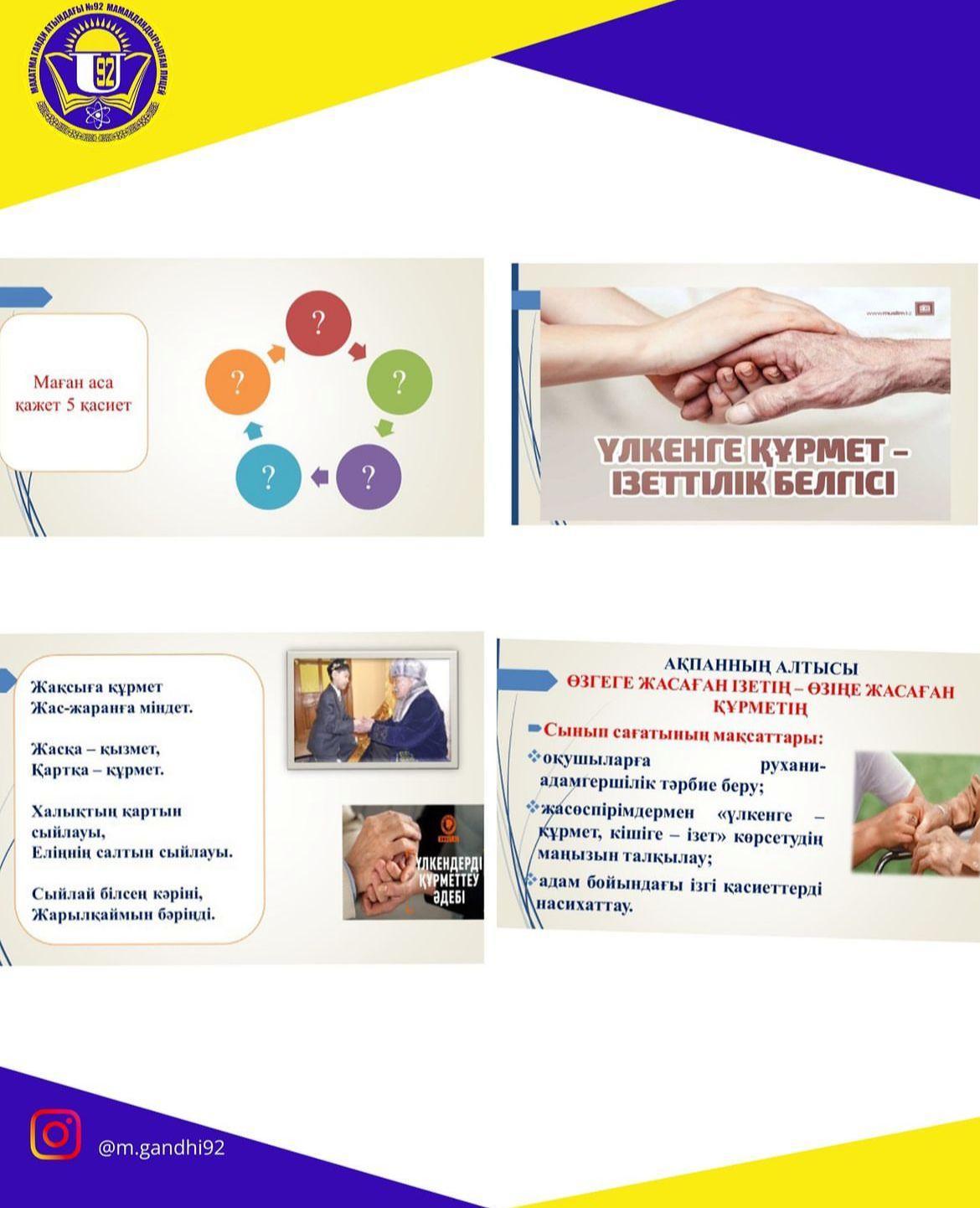 6 ақпан 2024 жылы 11 «А» сыныбында «Өзгеге жасаған ізетің – өзіңе жасаған құрметің» тақырыбында сынып сағаты өткізілді.