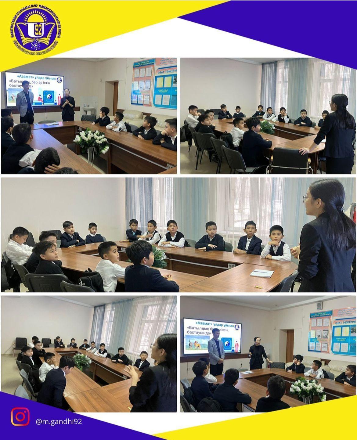16 февраль 2024 0 1 2 3 4 5 «Азамат» ұлдар ұйымының кезекті жиналысы 16.02.2024ж. күні лицейдің 5 «А» сынып ұлдарына директордың тәрбие жұмысы жөніндегі орынбасарлары М.Б. Абылқасым, Н.А. Айнетулла «Азамат» ұлдар ұйымының кезекті жиналысын өткізді. Тақырыбы: «Батылдық бар әр істің бастауында»