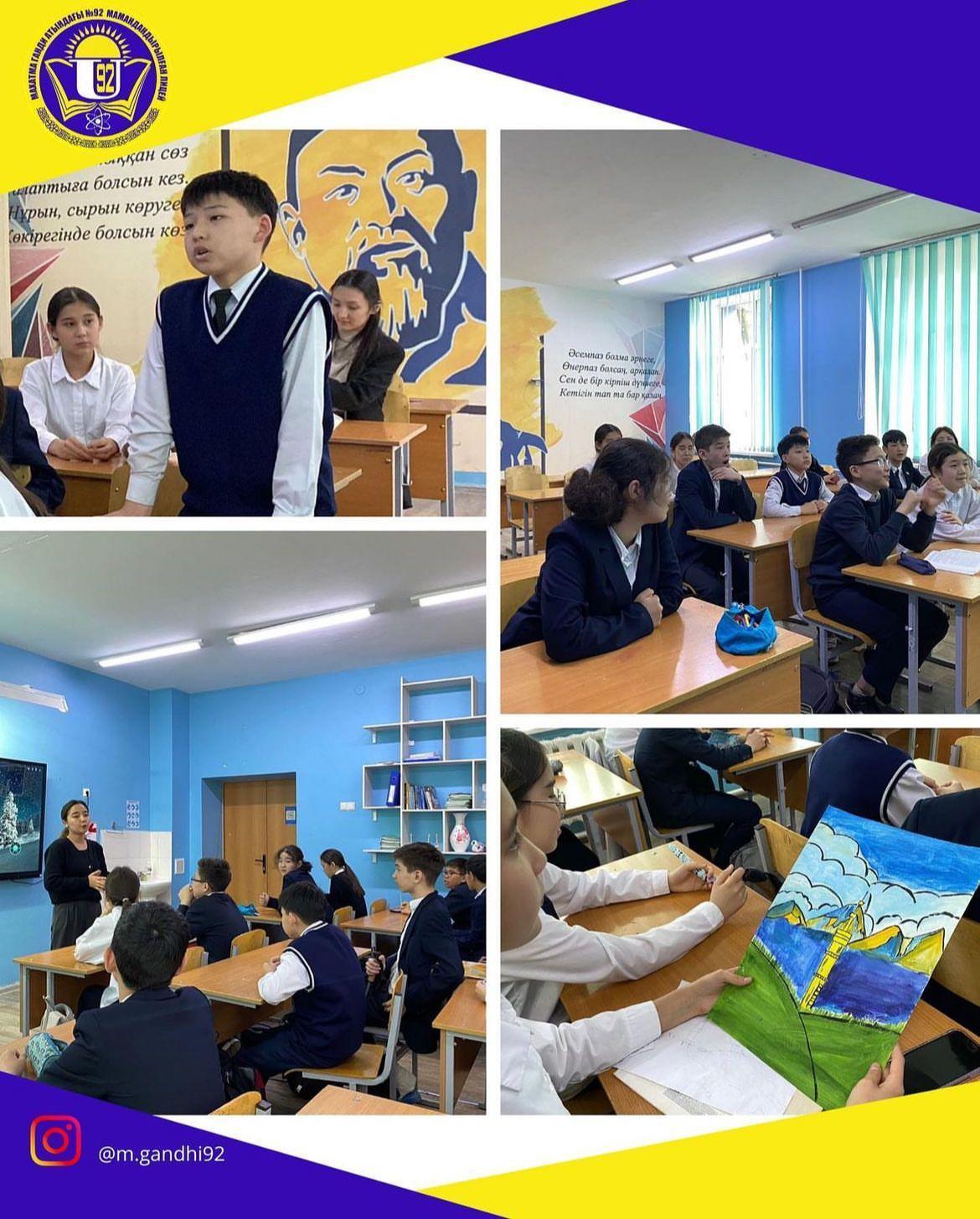 Алматы қаласы, Бостандық ауданы, Махатма Ганди атындағы №92 мамандандырылған лицей оқушыларына «Алматы - біздің қала» атты тақырыбында сынып сағаты өтілді.