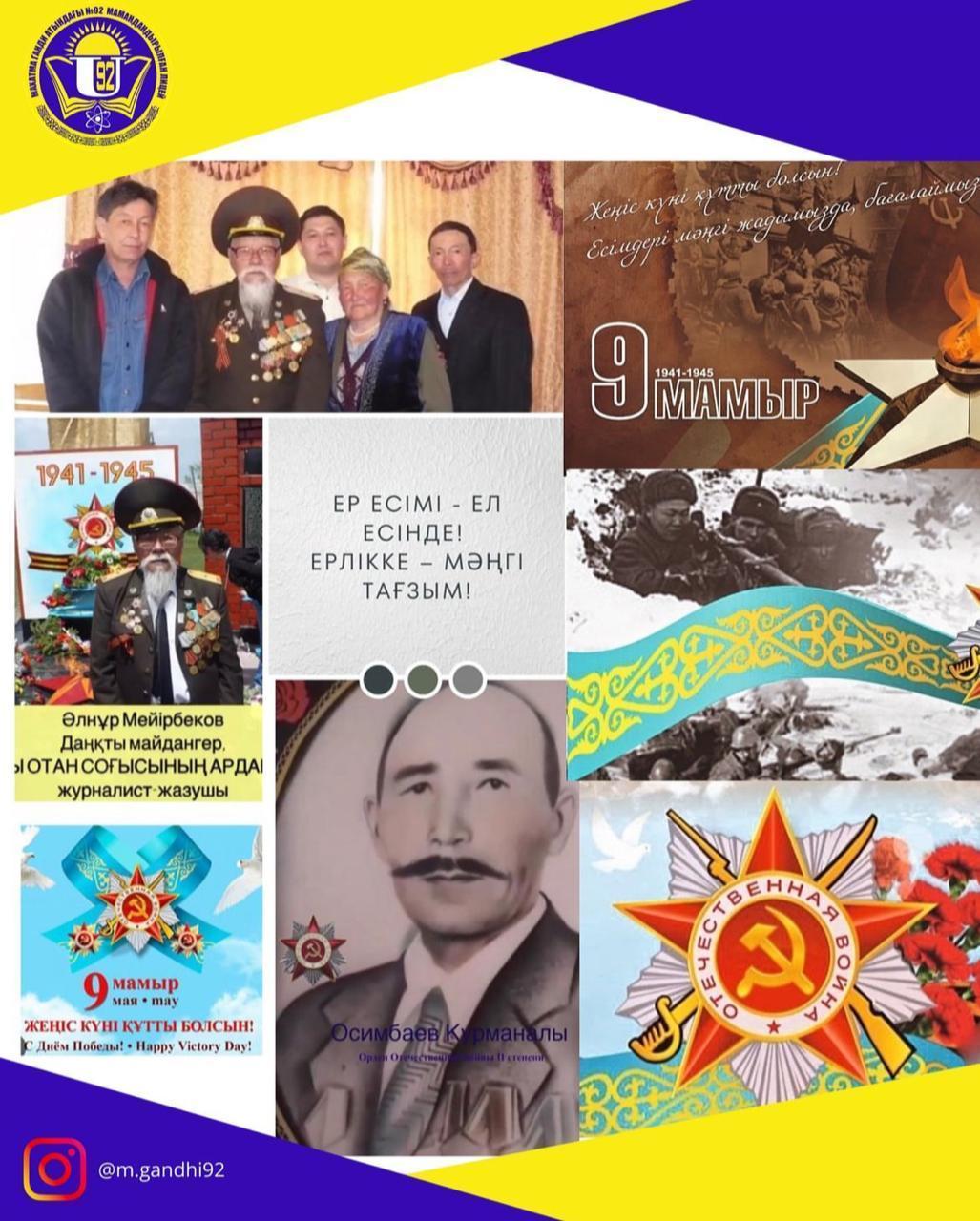Махатма Ганди атындағы №92 мамандандырылған лицейінің 5 «Ә» сынып оқушысы Лес Іңкәрдің атасы Мейірбеков Әлнұр даңқты майдангер, Ұлы Отан соғысының ардагері, журналист жазушы.