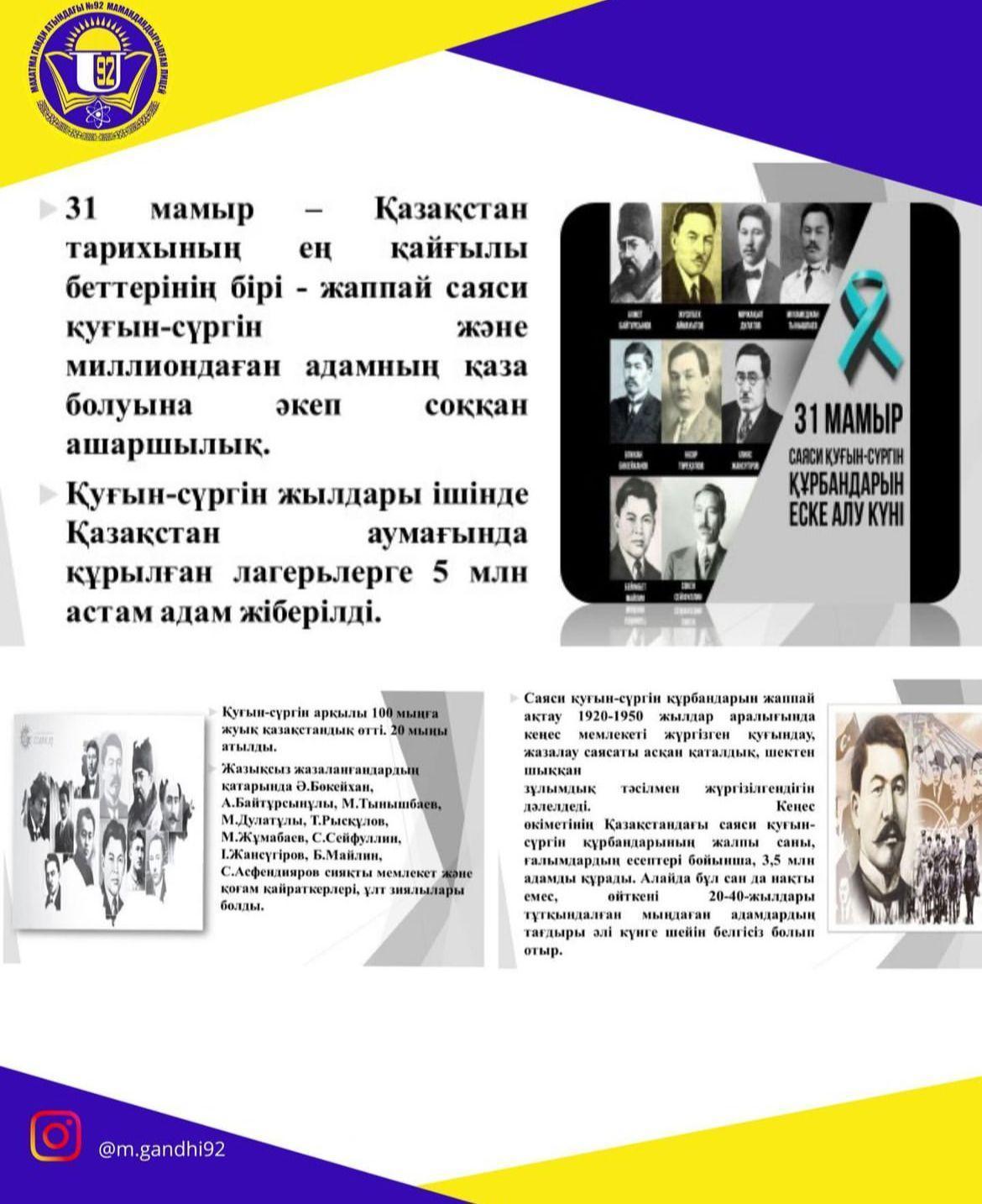 14 мамыр 2024 жылы 11 «А» сыныбында «Саяси қуғын-сүргін құрбандарын еске алу күні» тақырыбында сынып сағаты өткізілді.