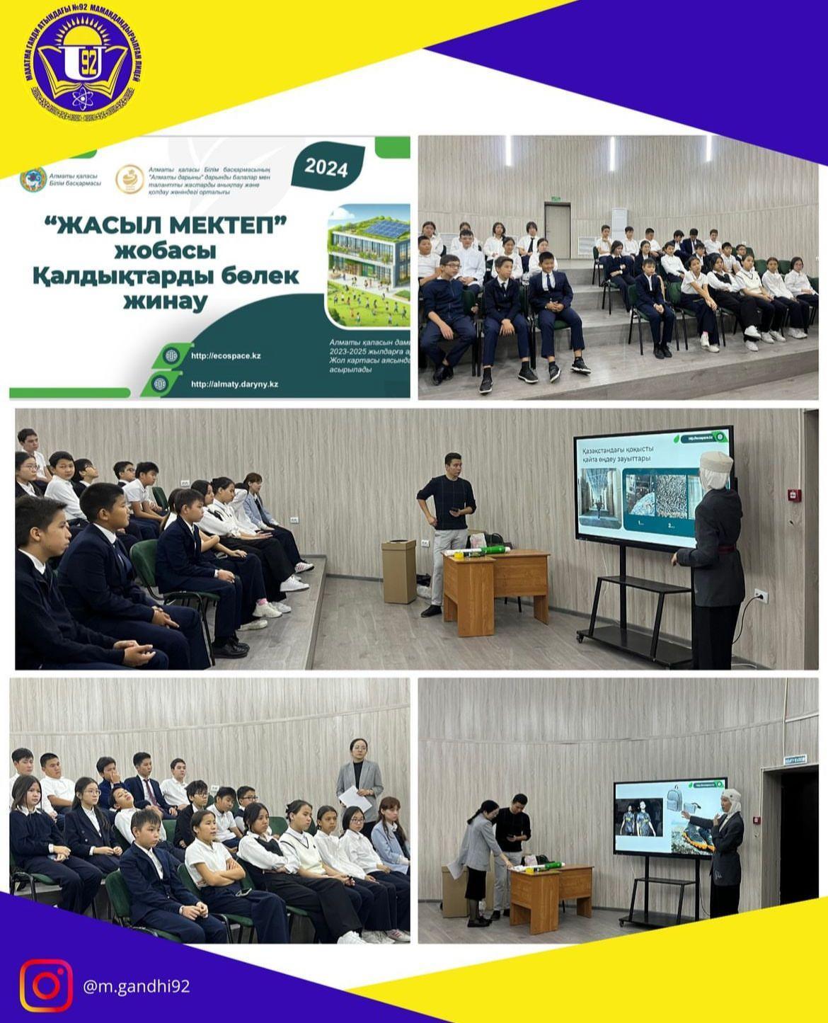 Махатма Ганди атындағы №92 мамандандырылған лицей оқушыларына «Жасыл мектеп» жобасы аясында «Қалдықтарды бөлек жинау» тақырыбында дәріс өтіліп, түсіндірме жұмыстары жүргізілді.