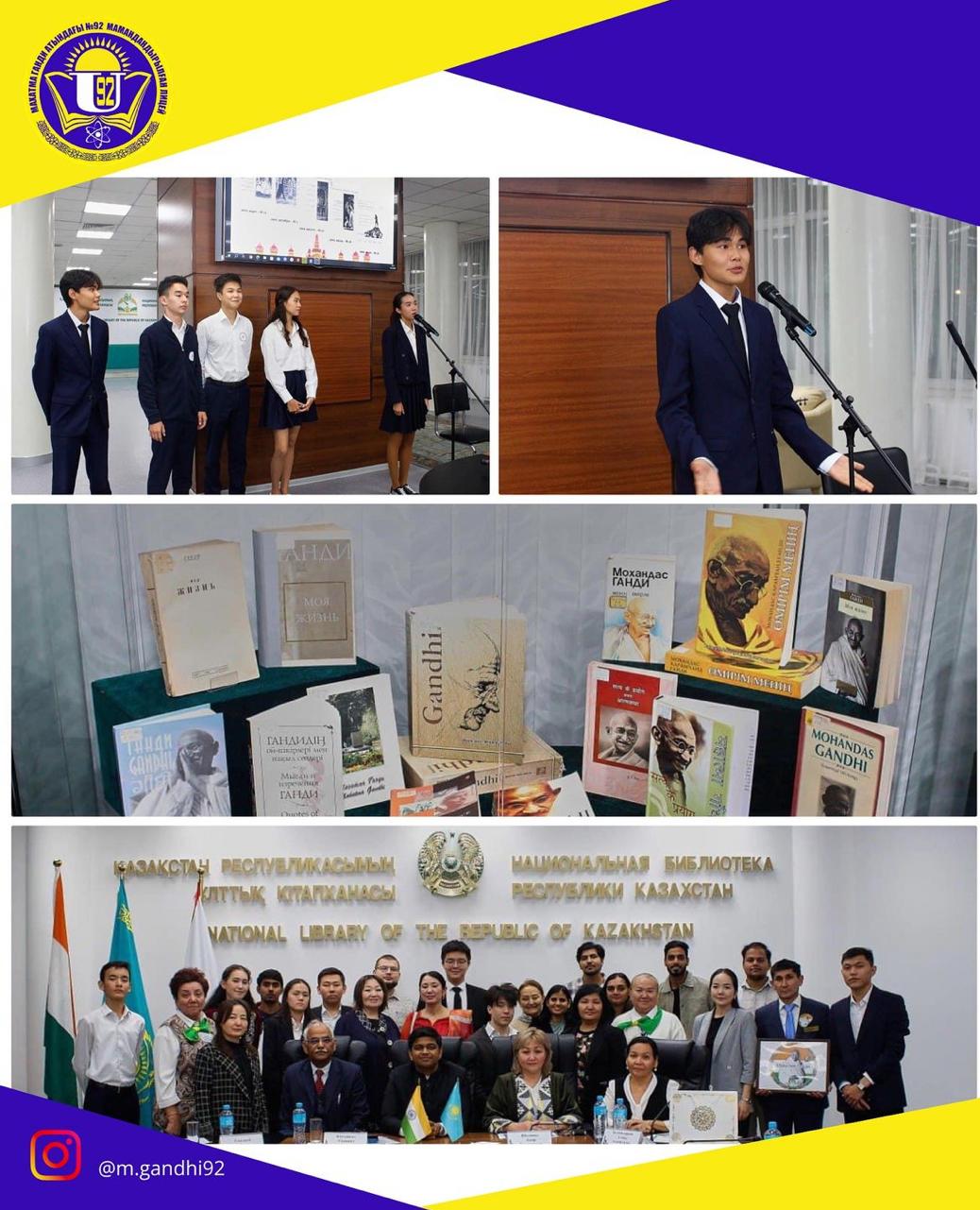 02.10.2024 ж. күні Үндістан кітап бұрышы жұмысының форматында Қазақстан Республикасы Ұлттық кітапханасының Н.Дәулетова атындағы залында Алматы қаласындағы Үндістан Елшігінің Өкілдігінің және Әл-Фараби атындағы ҚазҰУ Шығыстану факультетінің қолдауымен, М.Ганди атындағы №92 мамандандырылған лицейдің қатысуымен үнділік саясат және қоғам қайраткері Махатма Гандидің 155 жылдығына арналған «Менің өмірім - менің жолдауым» атты әдеби-музыкалық кеш өтті.⠀