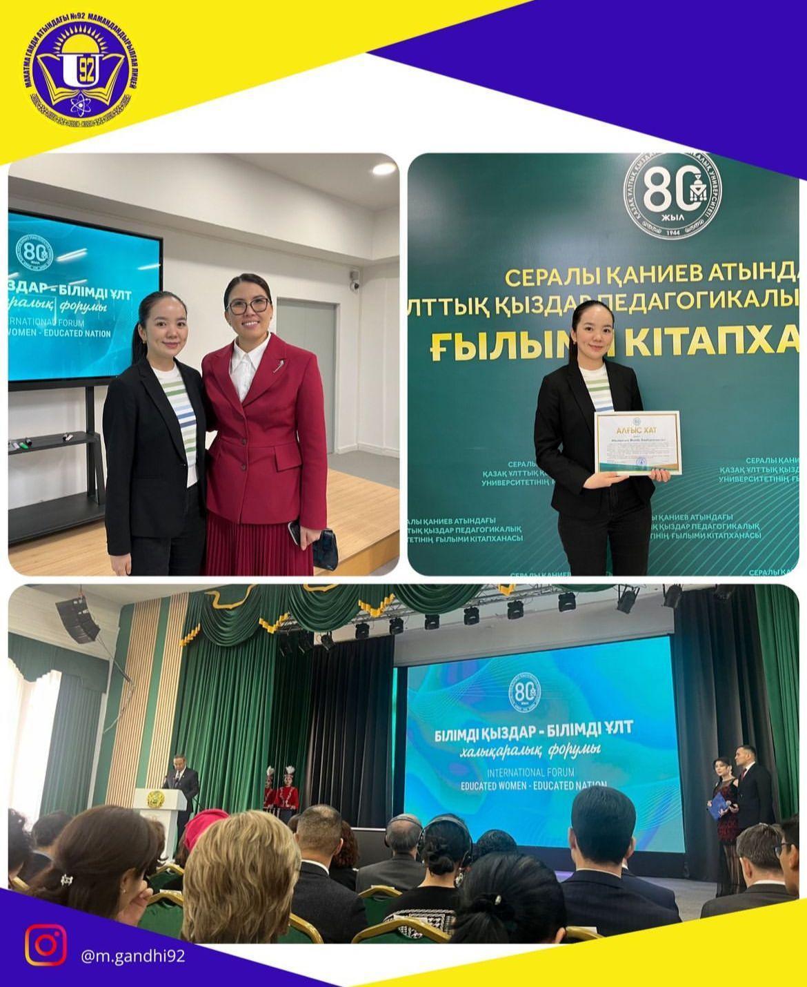 М.Б. Абылқасым лицеймен серіктестік жұмыстар атқаратын «Қазақ ұлттық қыздар педагогикалық университетінің» 80 жылдық мерейтойына байланысты ұйымдастырылған Халықаралық форумға қатысты.