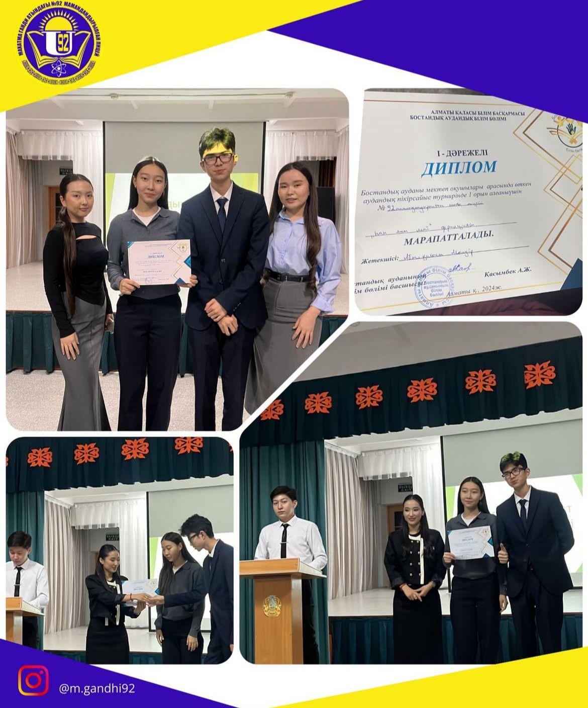 26 ноябрь 2024 0 1 2 3 4 5 Аудандық пікірсайыс турнирі Лицей мақтаныштары😍😍😍😍Бостандық ауданы мектеп оқушылары арасында өткен аудандық пікірсайыс турнирінде Махатма Ганди атындағы №92 Мамандандырылған лицей командасы 1 орын алганы үшін марапатталды.Жетекшісі:Абылқасым МөлдірҚұттықтаймыз!