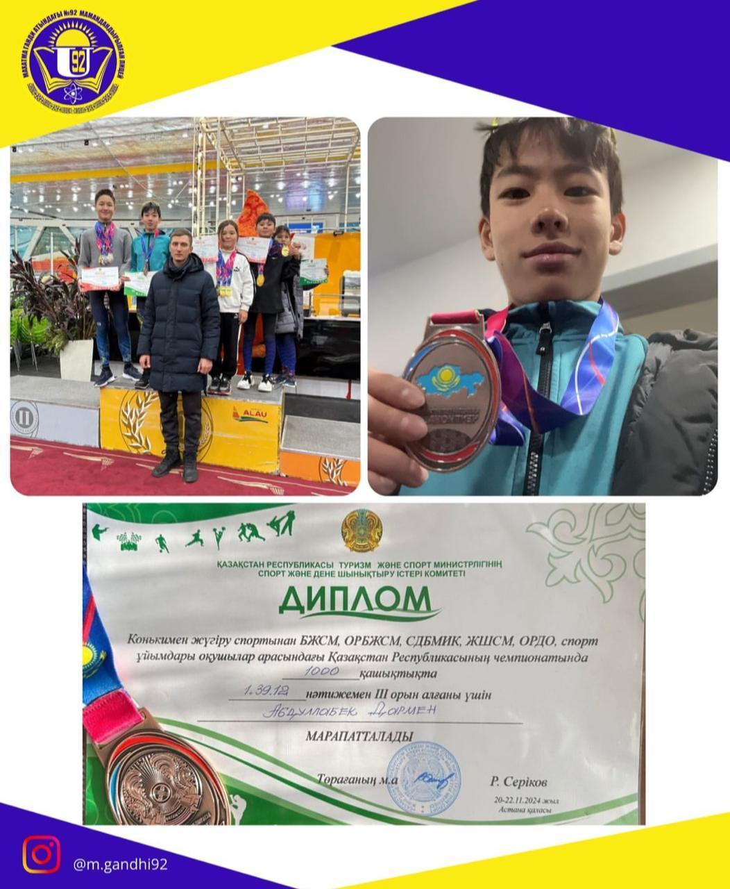 27 ноябрь 2024 0 1 2 3 4 5 Конькимен жүгіру спортынан ҚР-ның чемпионаты Конькимен жүгіру спортынан БЖСМ, ОРБЖСМ, СДБМИК, ЖШСМ,ОРДО, спорт ұйымдары оқушылар арасындағы Қазақстан Республикасының чемпионатында 1000 қашықтықта 1.39.12 нәтижемен 7«Б» сынып оқушысы Абдуллабек Дармен 3- орын иеленді.Құттықтаймыз!