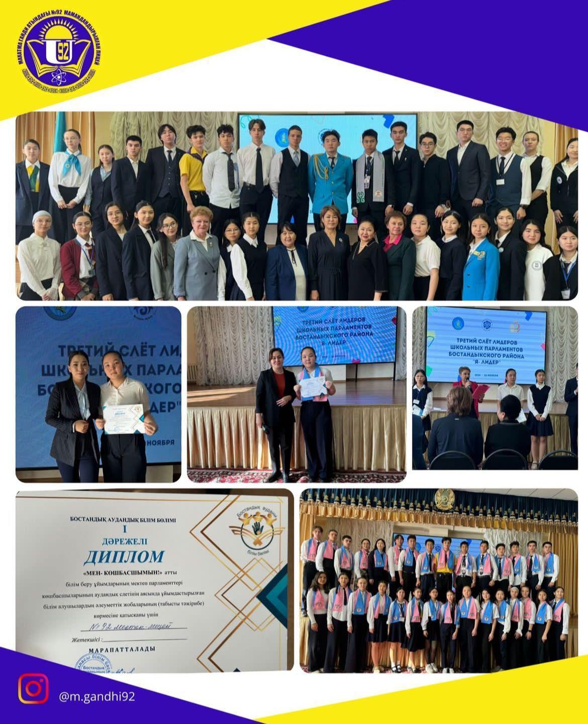 «МЕН- КӨШБАСШЫМЫН!» атты білім беру ұйымдарының мектеп парламенттері көшбасшыларының аудандык слетінің аясында ұйымдастырылған білім алушылардың әлеуметтік жобаларының (табысты тәжірибе) көрмесіне катысып I дәрежелі диплом алғаны үшін 9«Г» сынып оқушысы Махмет Балнұр Мұратқанқызы марапатталды.