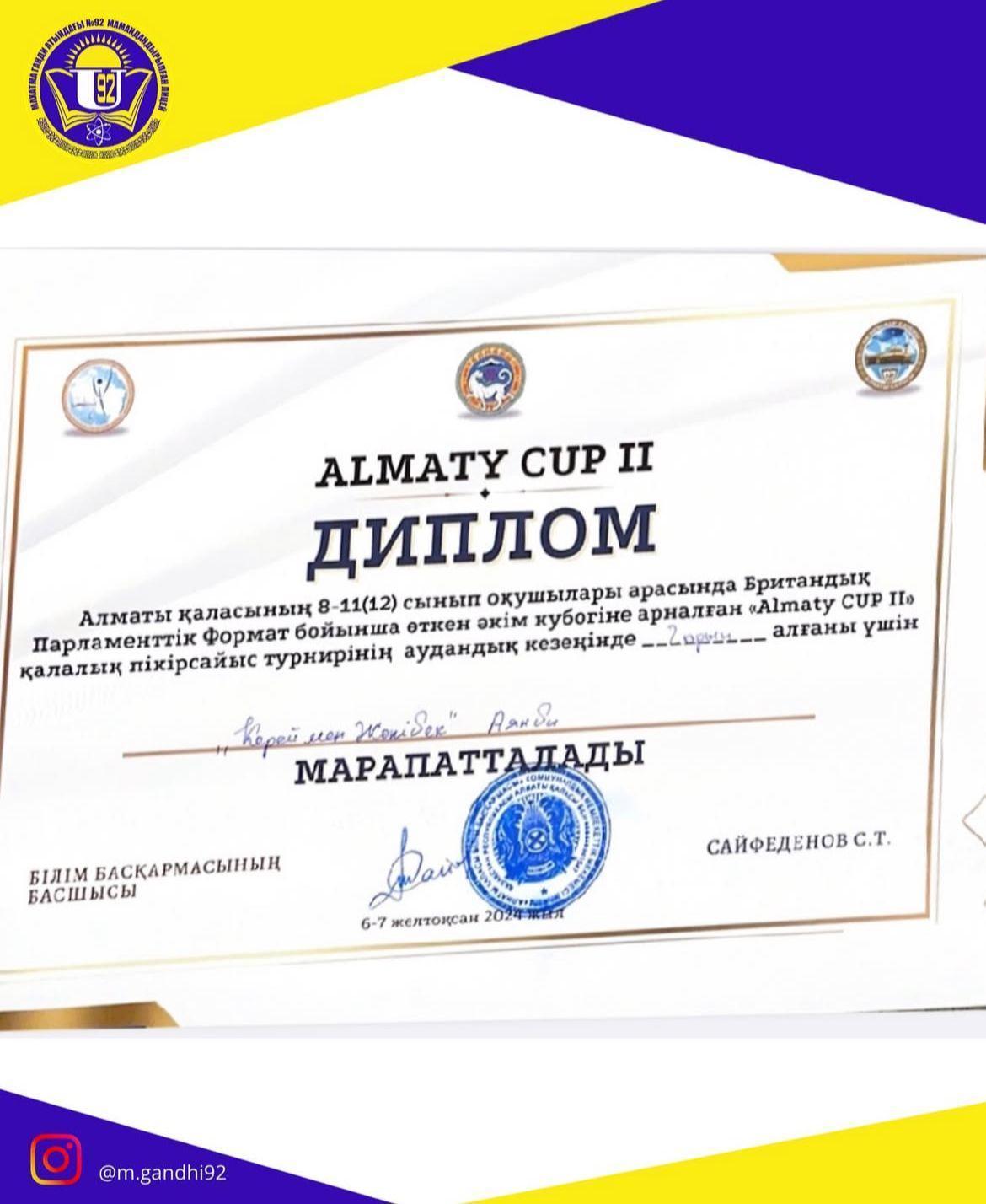Алматы қаласының 8-11(12) сынып оқушылары арасында Британдық Парламенттік Формат бойынша өткен әкім кубогіне арналған «Almaty CUP II» байқауында II дәрежелі орын алғаны үшін «Керей мен Жәнібек» командасы мүшесі 11 «Б» сынып оқушысы Султангазиев Аянби марапатталды.