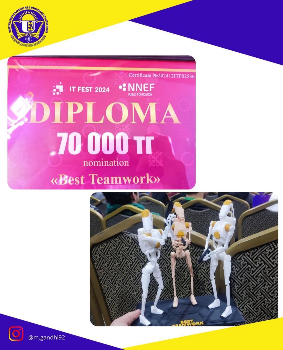 2024 жылдың 6-7 желтоқсан аралығында «Алматы дарыны» орталығы мен ҚБТУ бірлескен робототехника чемпионатында М.Ганди атындағы №92 мамандандырылған лицейдің 9 «Д» сынып оқушылары Серикбай Танирберген мен Курмангали Зейн «Best teamwork» номинациясы бойынша финалда жеңіске жетіп, 70 000 тг сыйақыға ие болды.