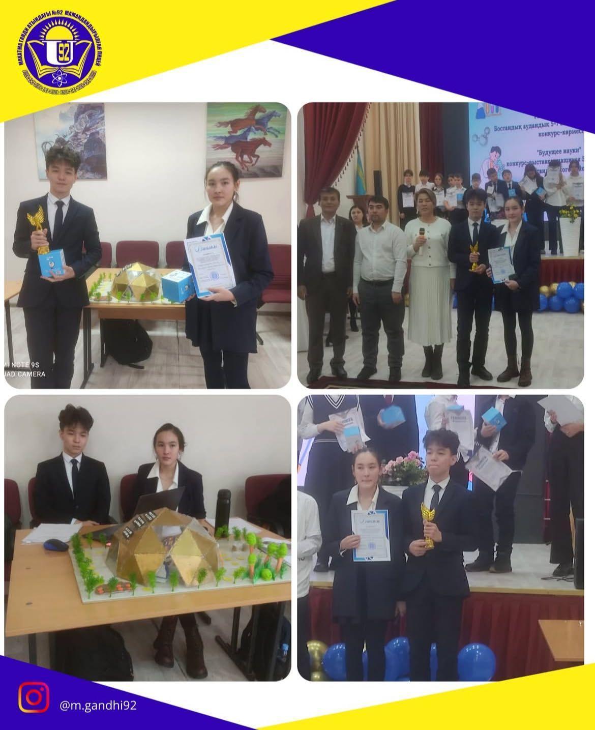 Бостандық ауданы әкімі мен аудандық білім бөлімінің ұйымдастыруымен өткізілген жалпы білім беретін мектептердің 5-7 сынып оқушылары арасындағы «Ғылым болашағы» атты ғылыми жобалар конкурс-көрмесінде 3-орын алғаны үшін 7«Б» сынып оқушылары: