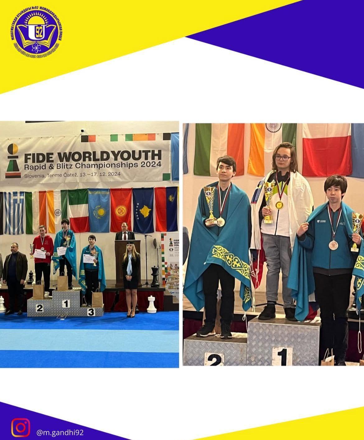 М.Ганди атындағы №92 мамандандырылған лицейдің 10 “Ә” сынып оқушысы Асылов Мирас шахматтан Словенияда өткен Әлем Чемпионатында Рапидтен күміс, блицтен қола жүлдеге ие болды.