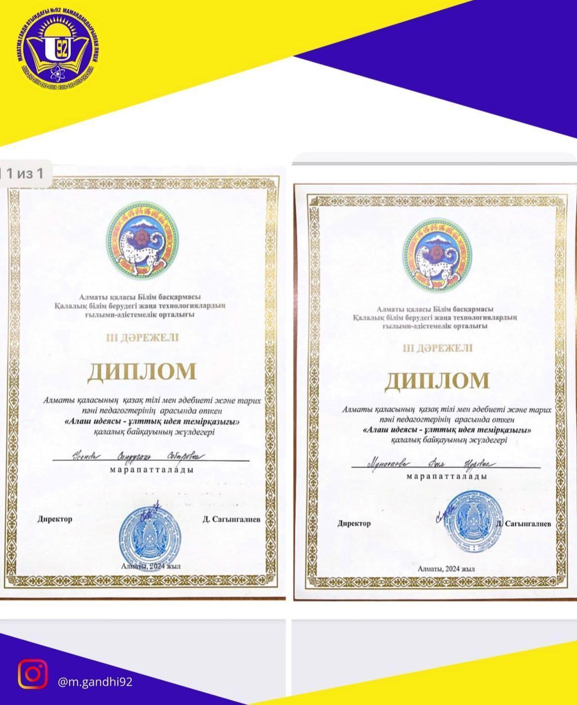 2.Қазақ тілі мен әдебиеті пәні мұғалімі Мунасаева Рая Нуровна III-🥉дәрежелі дипломдарымен марапатталды.