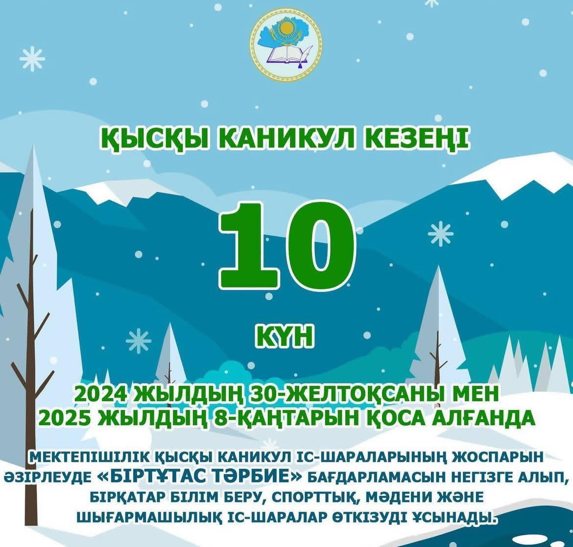 📌 Еске сала кетейік, осы оқу жылында қысқы демалыс 30 желтоқсаннан 8 қаңтарға дейін 10 күнге созылады. Ал бірінші сынып оқушылары үшін 2025 жылдың 10-16 ақпан аралығында 7 күн қосымша демалыс беріледі.