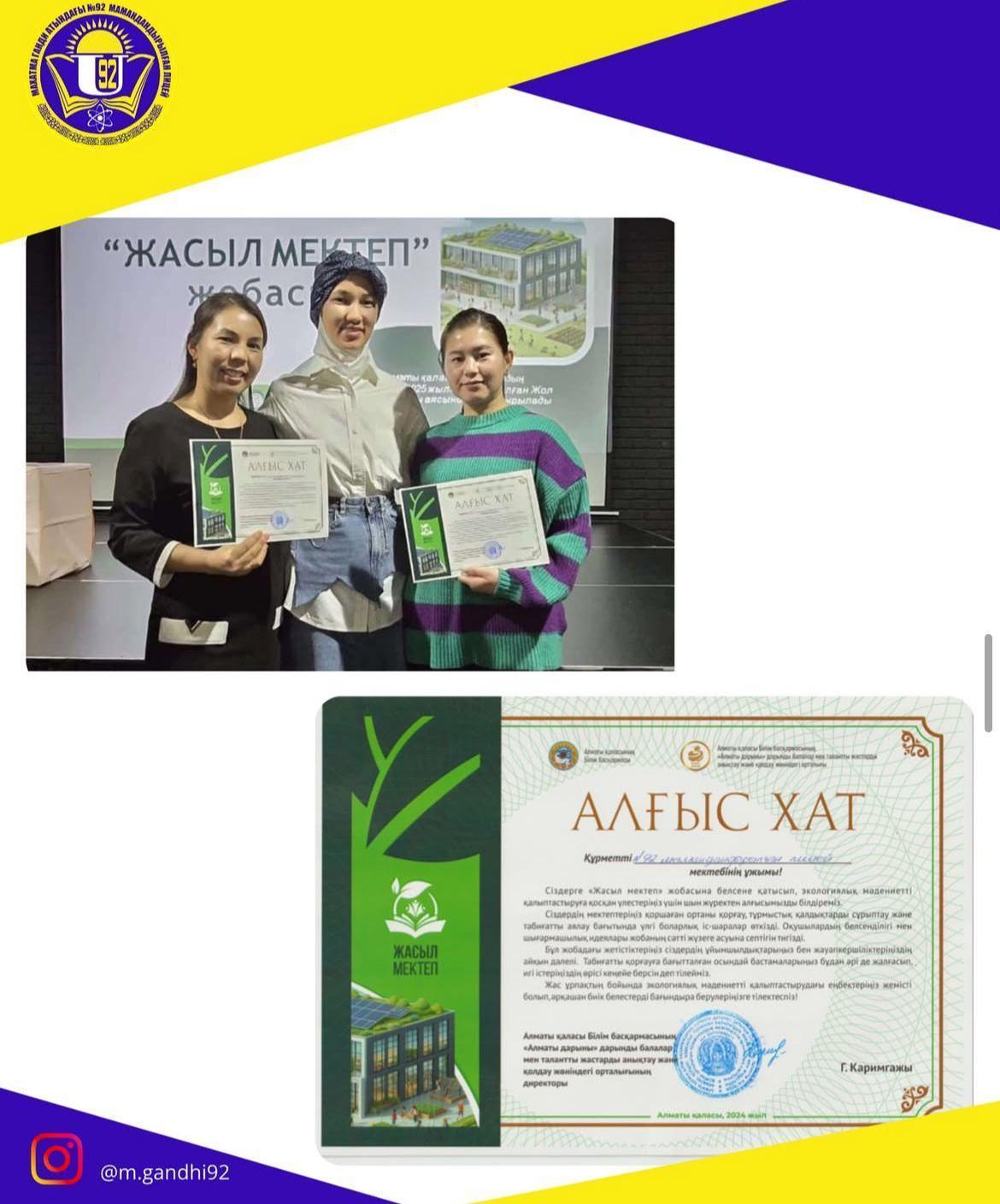 «Жасыл мектеп» жобасына белсене қатысып, экологиялық мәдениетті қалыптастыруға қосқан үлесі үшін Махатма Ганди атындағы №92 мамандандырылған лицей қатысушылары Алғыс хатпен марапатталды. Бұл марапат – баршамыздың ортақ жетістігіміз! Табиғатты сақтау, жасыл әлемді қолдау – әрқайсымыздың борышымыз.