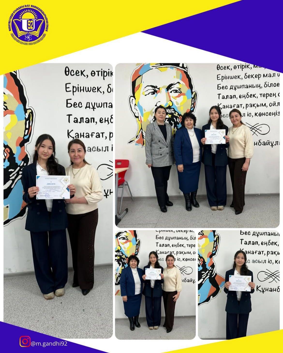 Жалпы білім беретін мектеп оқушыларының арасында Ұлы Абайдың шығармашылығын насихаттау мақсатында өткен «Абай әлемі» шығармашылық байқауының аудандық кезеңінің I дәрежелі диплом иегерлері: