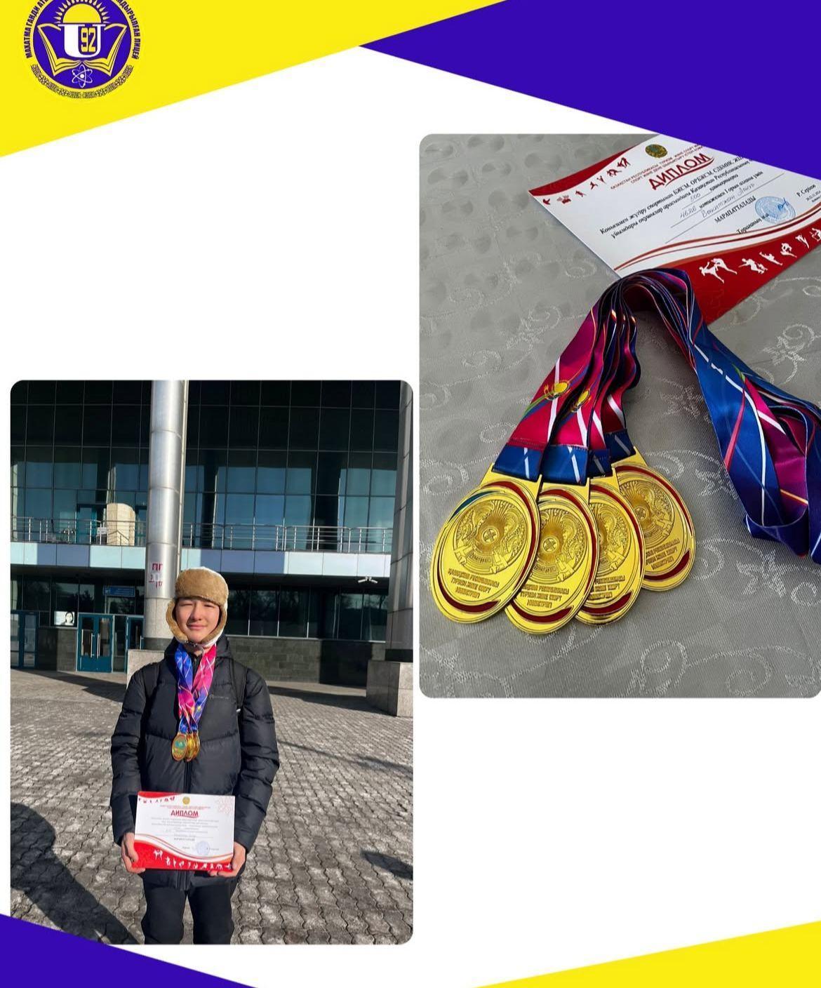 М.Ганди атындағы №92 мамандандырылған лицейдің 7 «Ә» сынып оқушысы Бакитжан Арнұр Қостанайда өткен Қазақстан Республикасының чемпионатында конькимен жүгіру спортынан бас жүлде иеленді. Сол нәтижеге сай 4 алтын медальмен оралып, қуантты.