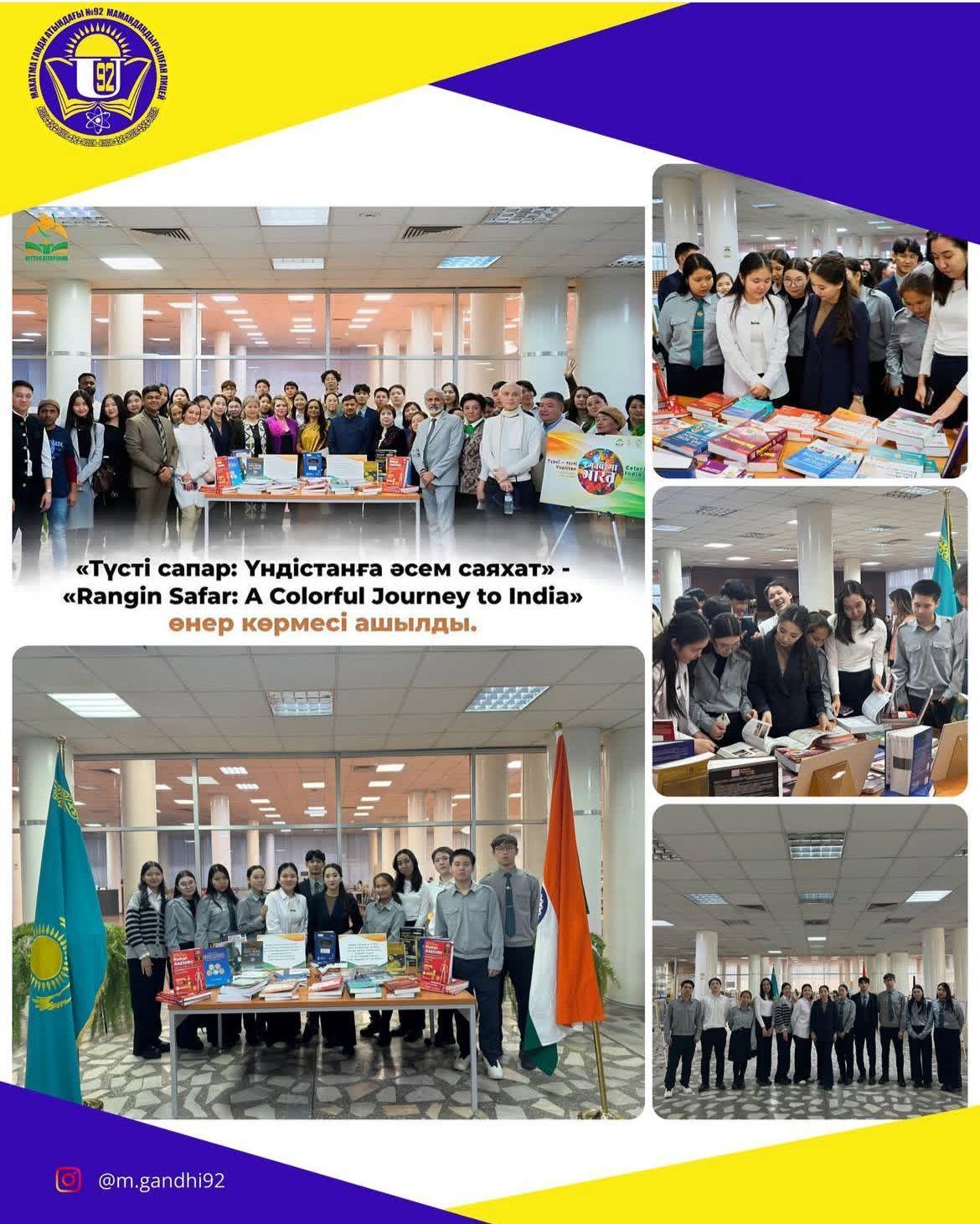 28 қаңтар Қазақстан Республикасының Ұлттық кітапханасында Үндістан кітап бұрышының қызметі аясында Үндістанның Республика күніне орай «Түсті сапар: Үндістанға әсем саяхат» - «Rangin Safar: A Colorful Journey to India» өнер көрмесінің салтанатты ашылуына М.Ганди атындағы №92 мамандандырылған лицейінің өзін-өзі басқару ұйымы және лицей директорының тәрбие ісі жөніндегі орынбасары Қуандықова Алия Сейілханқызы қатысты.