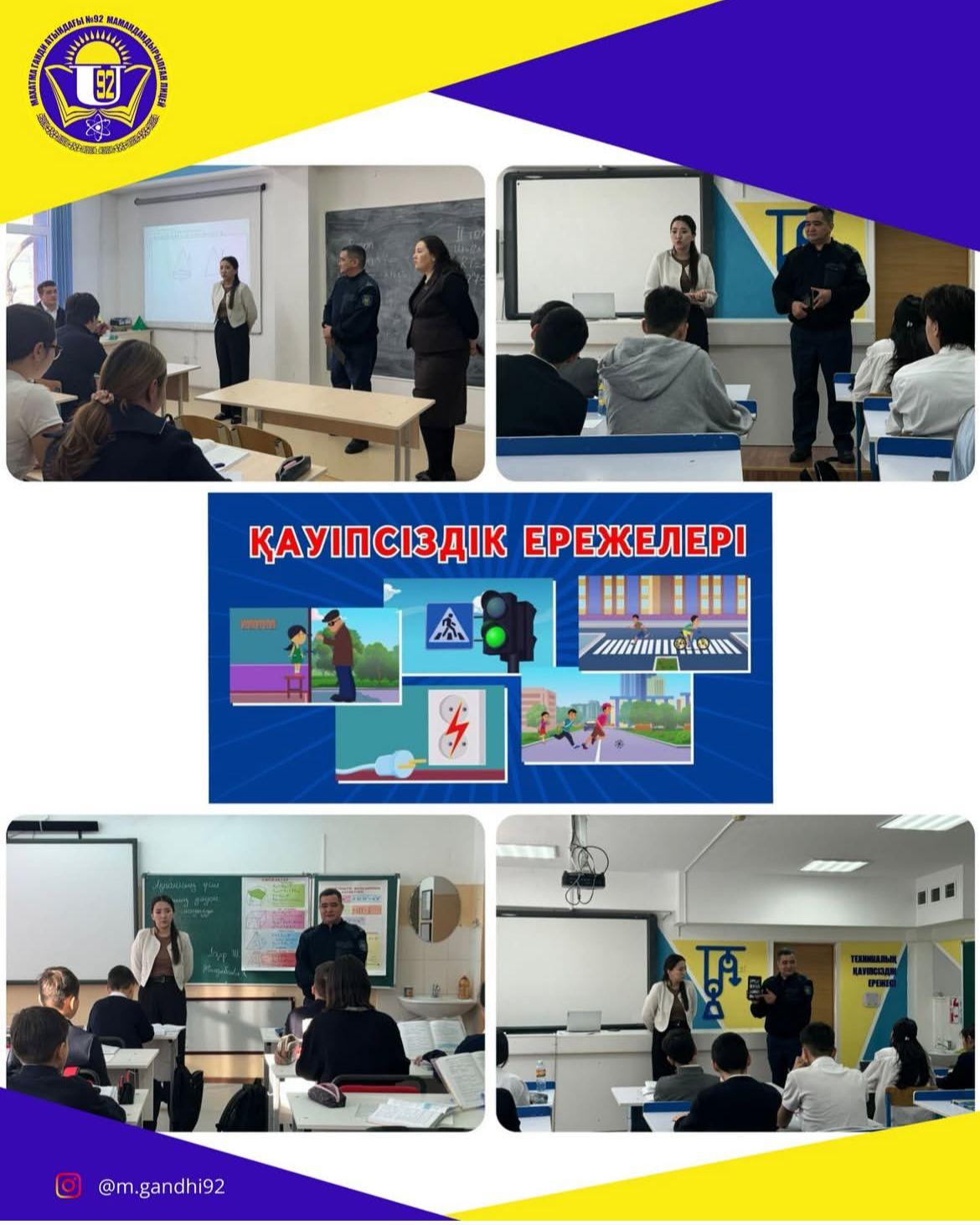 03.02.2025ж.М.Ганди атындағы №92 мамандандырылған лицей инспекторы Әлжанов Арман және директордың тәрбие ісі жөніндегі орынбасары Қуандықова Алия Сейілханқызы оқушыларға «Қауіпсіздік ережесі» тақырыбында түсініктеме жұмыстарын жүргізді.