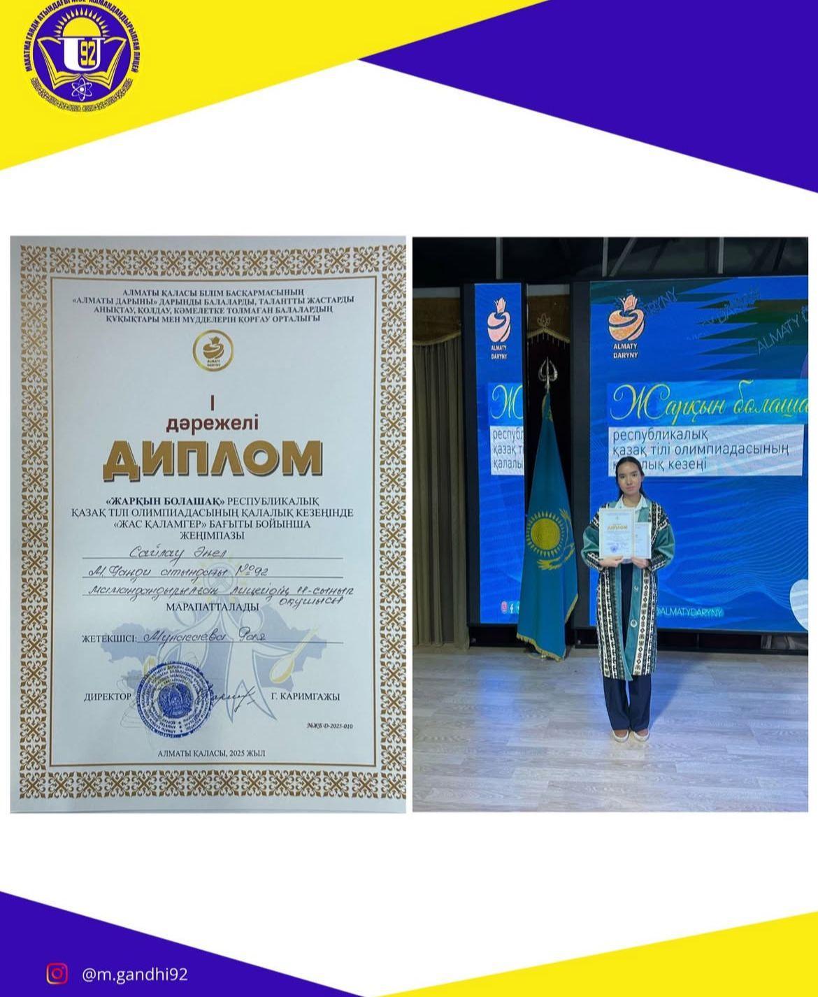 «Жарқын болашақ» Республикалық қазақ тілі олимпиадасының қалалық кезеңінде «Жас қаламгер» бағыты бойынша М.Ганди атындағы №92 мамандандырылған лицейінің 11-сынып оқушысы Сайлау Әнел 🥇дәрежелі дипломымен марапатталды.