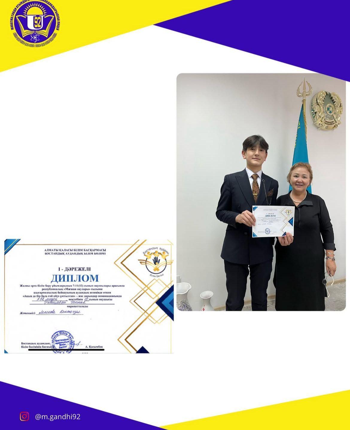 Жалпы орта білім беру ұйымдарыньң 7-11(12) сынып оқушылары арасында республикалық «Мағжан оқулары» ғылыми шығармашылық байкауыньң аудандық кезеңінде өткен «Ақын да бip бала ғой айға ұмтылтан» - жас дарындар номинациясында М.Ганди атындағы №92 мамандандырылған лицейдің 9 сынып оқушысы Рахимбай Тыныс I дәрежелі дипломымен марапатталды.