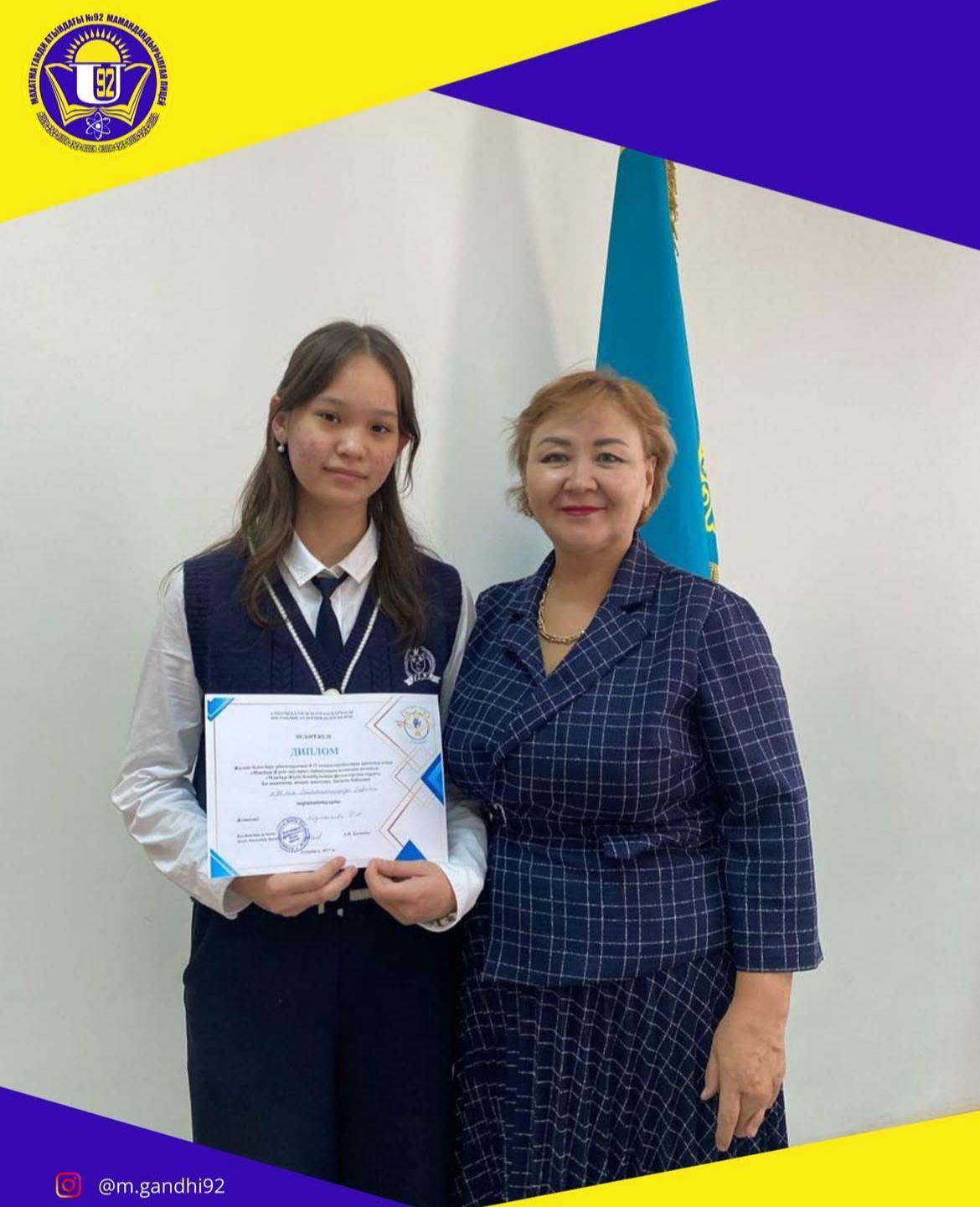 Жалпы білім беру ұйымдарының 8-11 сынып оқушылары арасында өткен «МәшҺүр-Жүсіп оқулары» байқауының аудандық кезеңінің «Мәшһүр-Жүсіп Көпейұлының фольклорлық мұрасы. Би-шешендер, жырау-ақындар»бағыты бойынша Сейітжаппарқызы Сабина III дәрежелі дипломымен марапатталды.